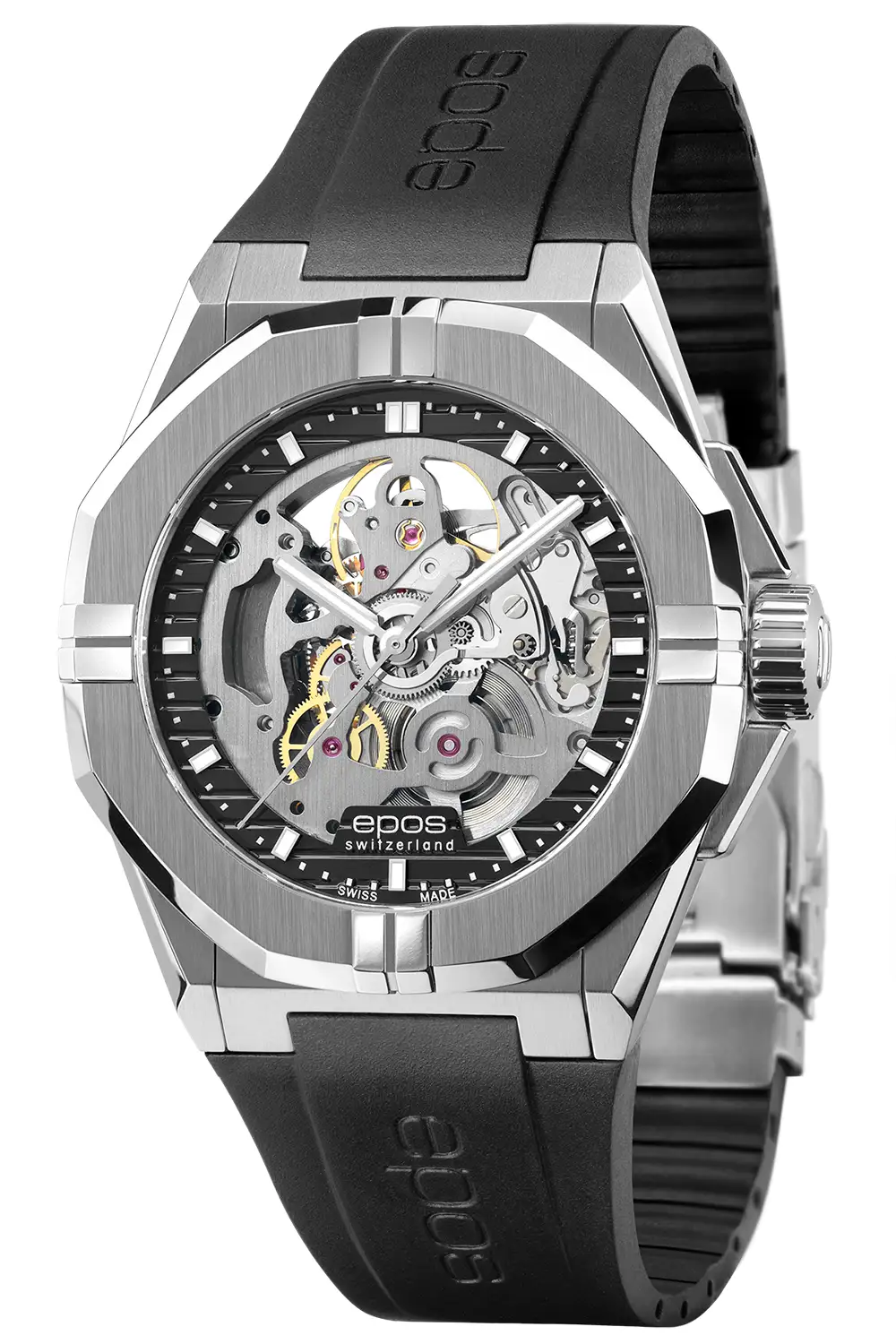 Pánské hodinky Epos Sport Skeleton 3506.139.20.15.55 jsou sportovní skeletonový model, ve kterém byla celá konstrukce ciferníku otevřena, aby odhalila práci automatického strojku Sellita SW200. Ažurové prvky, precizní výřezy a ruční zdobení vytvářejí kompozici, kterou ocení každý milovník mechaniky – od soustavy převodů až po setrvačku pracující s charakteristickým rytmem. Není to jen hodinky, ale forma hodinářské expresivity, umožňující pozorovat pohyb času v jeho nejčistší podobě.