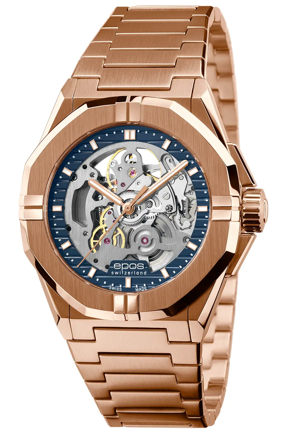 Růžové zlato PVD na pouzdře a náramku ve spojení s modrým kroužkem ciferníku vytváří efekt luxusu podaného v moderním, sportovním stylu. Ažurový střed ciferníku, ponechávající viditelnou celou architekturu strojku, byl doplněn čitelnými indexy, což zajišťuje výbornou rovnováhu mezi efektností a funkčností. Díky prosklenému víku může majitel obdivovat práci strojku také ze spodní strany, což je u skeletonových hodinek jedna z obzvláště ceněných vlastností.