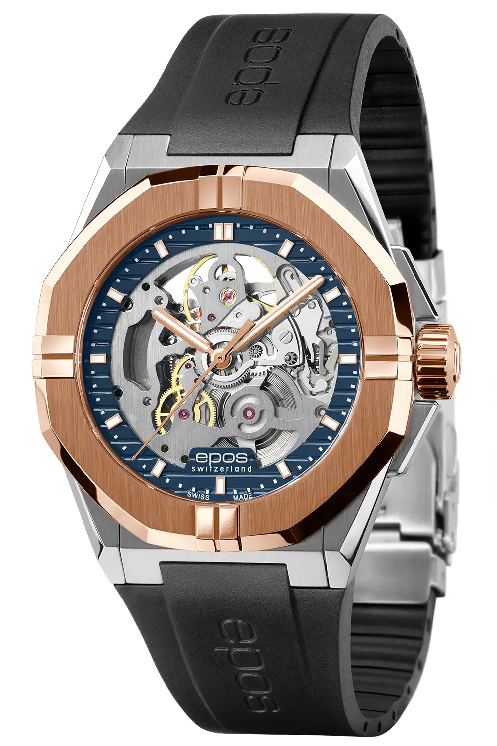Pánské hodinky Epos Sport Skeleton 3506.139.34.16.55 upoutají pozornost na první pohled díky skeletonové konstrukci odhalující chod automatického strojku Sellita SW200. Precizně vyřezané desky a můstky a ruční zdobení vytvářejí efekt miniaturní plastiky, v níž každý detail ukazuje mistrovství švýcarských hodinářů. Jsou to hodinky, které umožňují vidět energii přenášenou z každého pohybu zápěstí přímo na ozubená kola a setrvačku.