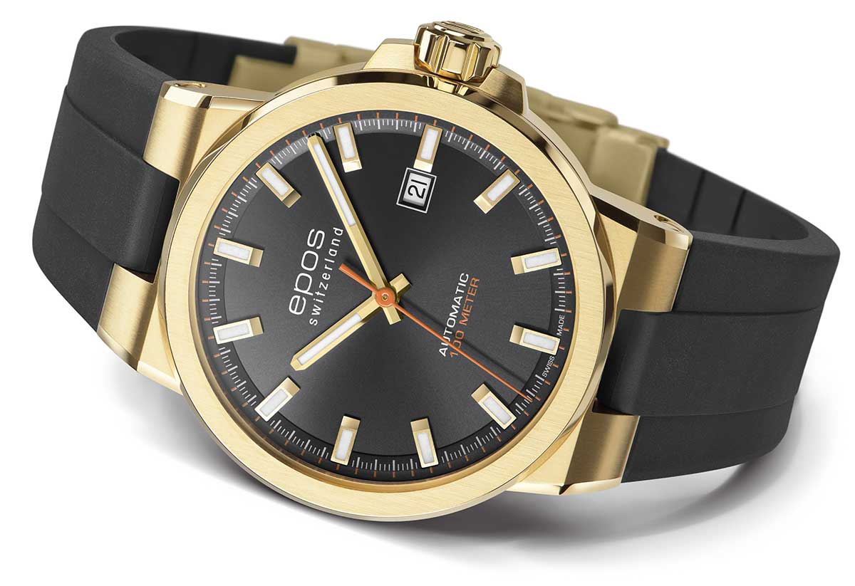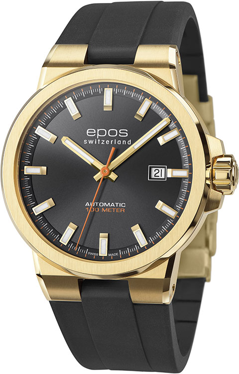 Švýcarská značka EPOS představuje dynamické sportovní hodinky Epos Sportive 3442.132.22.14.55 . Poháněno pečlivě zdobeným, známým Machinekem ETA 2824 . Prémiové matně žluté PVD pozlacené pouzdro s leštěnými hranami se hladce integruje s černým voděodolným gumovým páskem. Sportovní charakter modelu Sportive podtrhuje voděodolnost do 10 bar / 100 m, typicky pánské velikosti o průměru 42 mm a tloušťce 10,40 mm. Celý je vyroben z nerezové oceli, odolné vůči korozi. Dvouvrstvý ciferník s datumovkou je dostupný v úžasné černé barvě. Povrchová úprava sunburst je doplněna víceúhlovými leštěnými, ručně aplikovanými indexy. Epos Sportive jsou perfektním doplňkem pro nadšence do mechanických hodinek, kteří hledají luxusní sportovní hodinky Swiss Made, které v den důležitých obchodních jednání nemusí zůstávat v šuplíku.