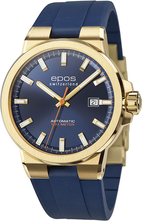 Švýcarská značka EPOS představuje dynamické sportovní hodinky Epos Sportive 3442.132.22.16.56 . Poháněno pečlivě zdobeným, známým Machinekem ETA 2824 . Prémiové matně žluté PVD pozlacené pouzdro s leštěnými hranami se hladce integruje s modrým voděodolným gumovým páskem. Sportovní charakter modelu Sportive podtrhuje voděodolnost do 10 bar / 100 m, typicky pánské velikosti o průměru 42 mm a tloušťce 10,40 mm. Celý je vyroben z nerezové oceli, odolné vůči korozi. Dvouvrstvý ciferník s datumovkou je dostupný v úžasné modré barvě. Povrchová úprava sunburst je doplněna víceúhlovými leštěnými, ručně aplikovanými indexy. Epos Sportive jsou perfektním doplňkem pro nadšence do mechanických hodinek, kteří hledají luxusní sportovní hodinky Swiss Made, které v den důležitých obchodních jednání nemusí zůstávat v šuplíku.