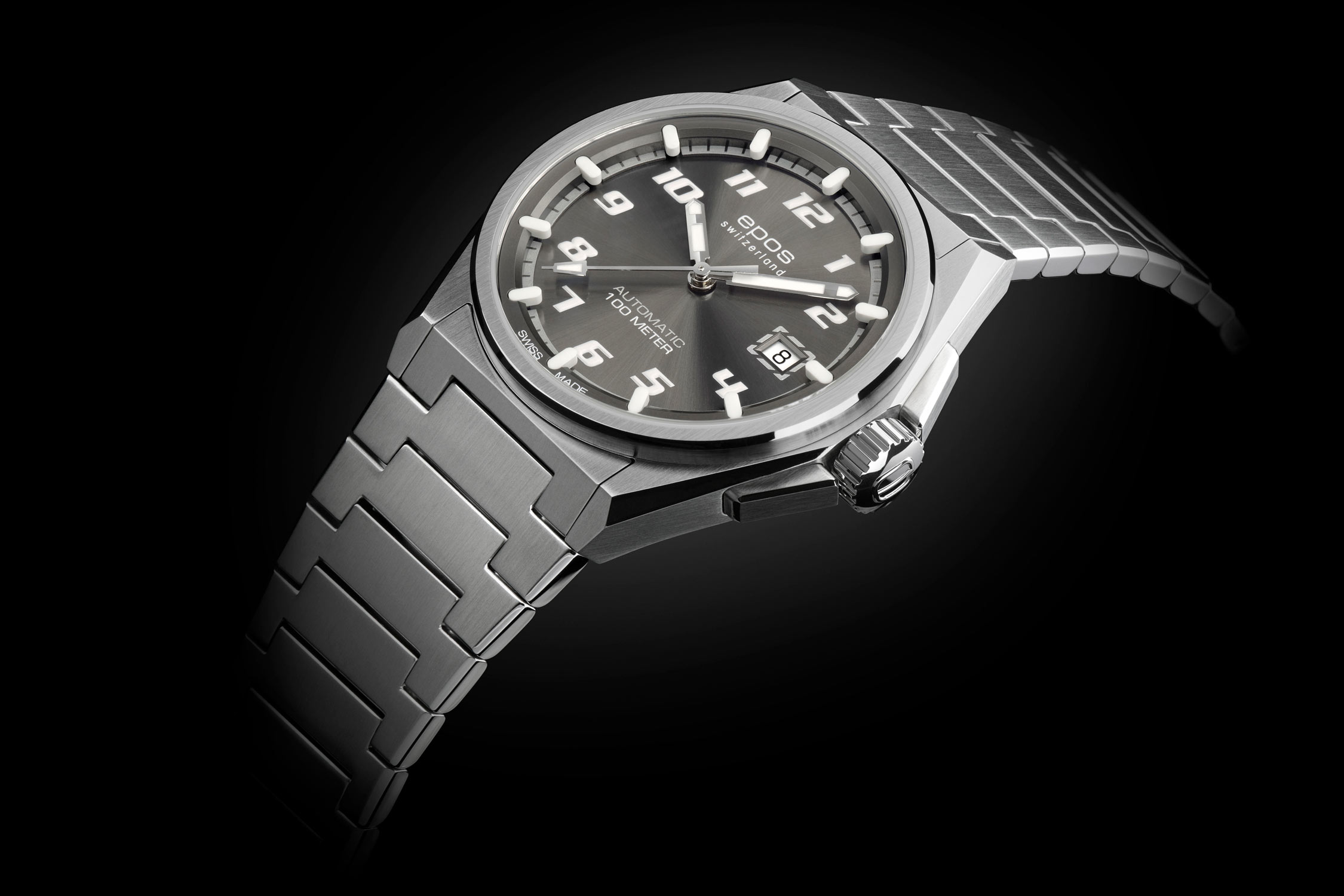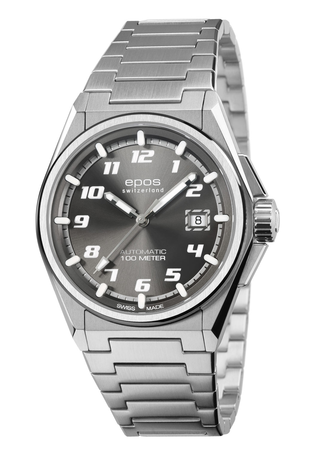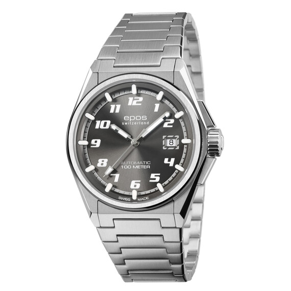Pod sklíčkem je ciferník s indexy ve sportovním fontu. Luminiscenční, trojrozměrné indexy Super-LumiNova zajišťují snadné čtení za všech světelných podmínek. Stupnice se sloupcovými indexy a vteřinová ručka jsou k dispozici v kontrastní bílé barvě. Šedý ciferník doplňuje datumové okénko na tři hodiny. Zobrazení data informuje o aktuálním dni v měsíci. Srdcem hodinek Epos Automatic je spolehlivý, zdobený strojek SW200, známý svou mimořádnou přesností a spolehlivostí. Tento švýcarský strojek zajišťuje dokonalé měření času, takže je dokonalým společníkem pro ty, kteří požadují jen dokonalost. Jeho rezerva chodu nabízí provoz až 38 hodin.