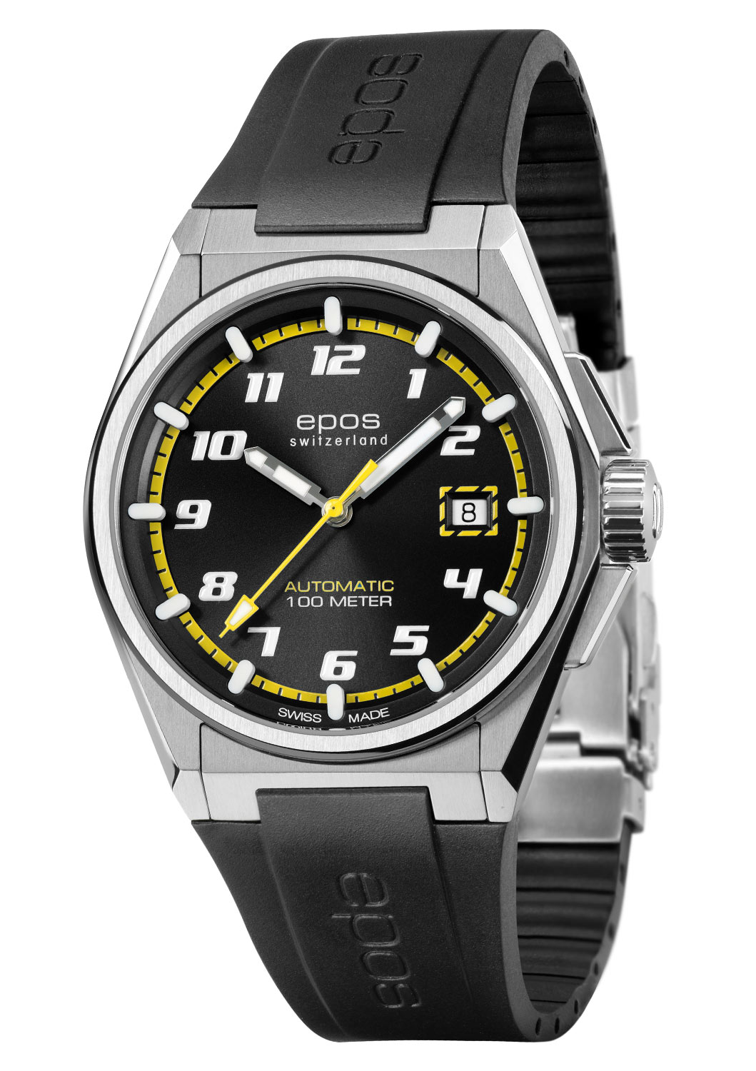 Pod sklem se nachází číselník s indexy ve sportovním písmu. Luminescenční trojrozměrné indexy Super-LumiNova zajišťují snadné čtení za jakýchkoli světelných podmínek. Stupnice s čárkovanými indexy a sekundová ručička jsou v kontrastní žluté barvě. Černý ciferník je doplněn o okénko pro zobrazení data na pozici třetí hodiny, které ukazuje aktuální den v měsíci. Srdcem hodinek Epos Automatic je spolehlivý, zdobený mechanizmus SW200, známý svou výjimečnou přesností a spolehlivostí. Tento švýcarský mechanizmus zajišťuje dokonalé měření času a činí z hodinek ideálního společníka pro ty, kteří vyžadují jen to nejlepší. Jejich rezerva chodu nabízí až 38 hodin provozu.