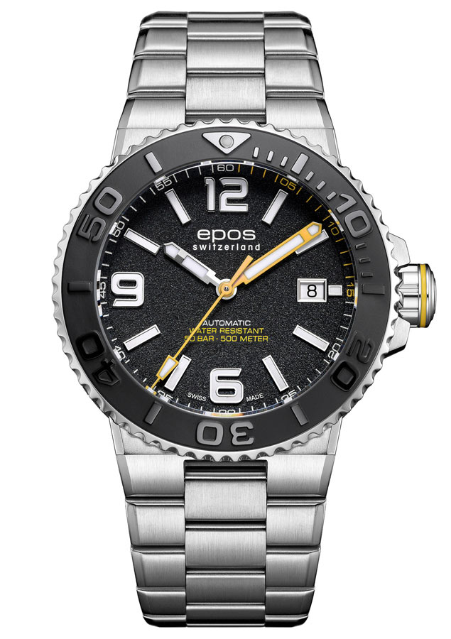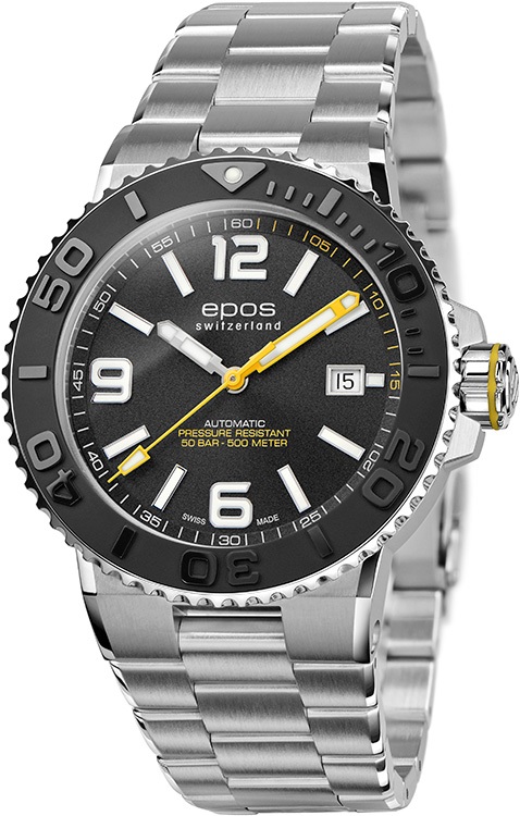 Špičkové diverské hodinky Epos Sportive Diver 3441.131.20.55.30 , které splňují ty nejvyšší nároky diverského světa. Nově vyvinutý diverský časovač má keramickou lunetu pro pohodlné měření času a pouzdro a náramek jsou vyrobeny z nejkvalitnější nerezové oceli 316L. Srdcem hodinek je známý automatický Machineek ETA 2824, proslulý svou spolehlivostí. Inženýři Epos zvolili propracovaný design pouzdra se zakřiveným safírovým sklem, aby zdůraznili jedinečný styl. Hodinky vybavené heliovým ventilkem mají extrémně vysokou třídu těsnosti, až 50 barů / 500 metrů! S takovými parametry může tento model doprovázet profesionální divere při objevování podmořského světa s plnou výbavou. Takto odolné a povětrnostním vlivům odolné hodinky poslouží nejen při náročných cestách, ale budou i skvělým společníkem každý den. Tomu nasvědčuje elegantní povrchová úprava a dokonale sladěné složení barev: černá, ocelová a žlutá, která celek zvýrazňuje. Dynamický, ale zároveň elegantní design je výkladní skříní sportovních hodinek švýcarského výrobce EPOS.