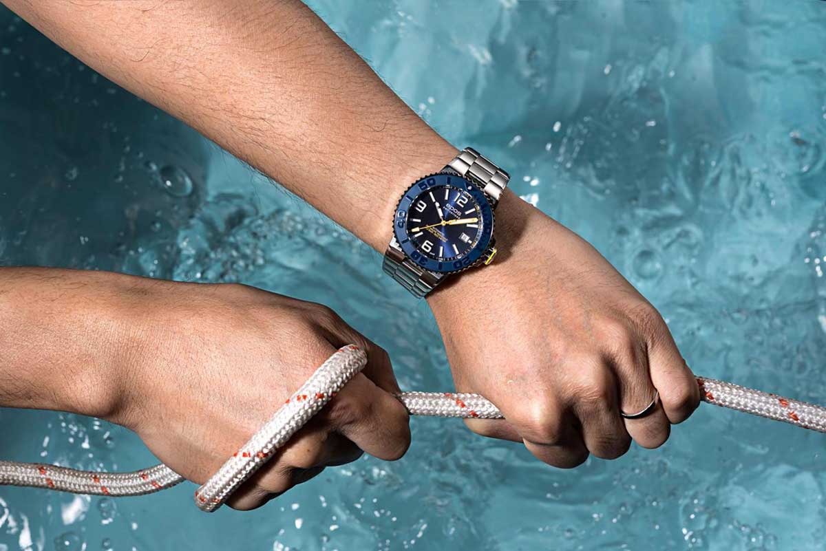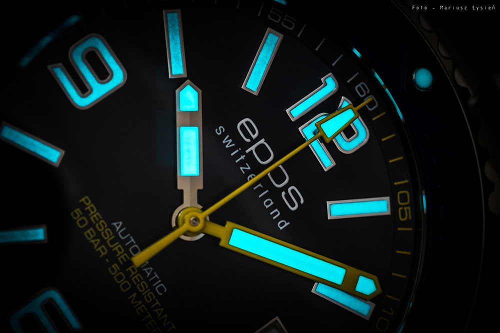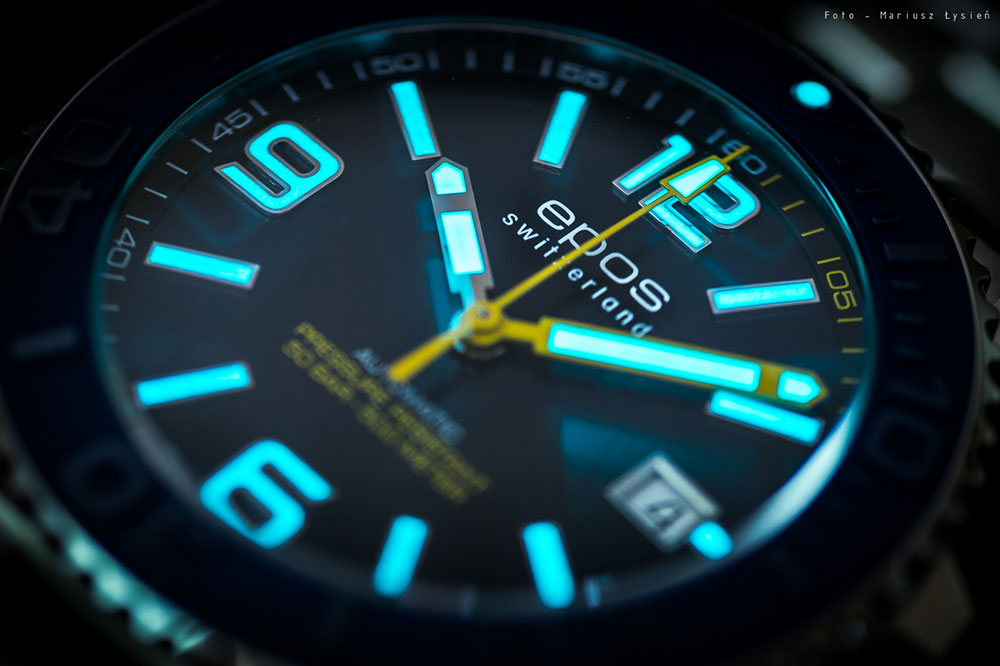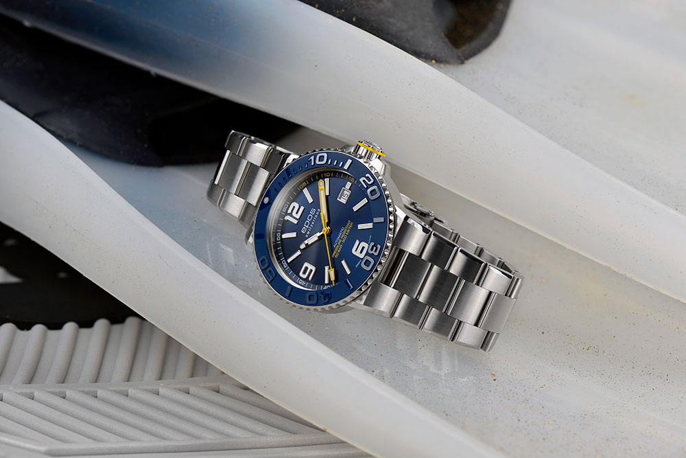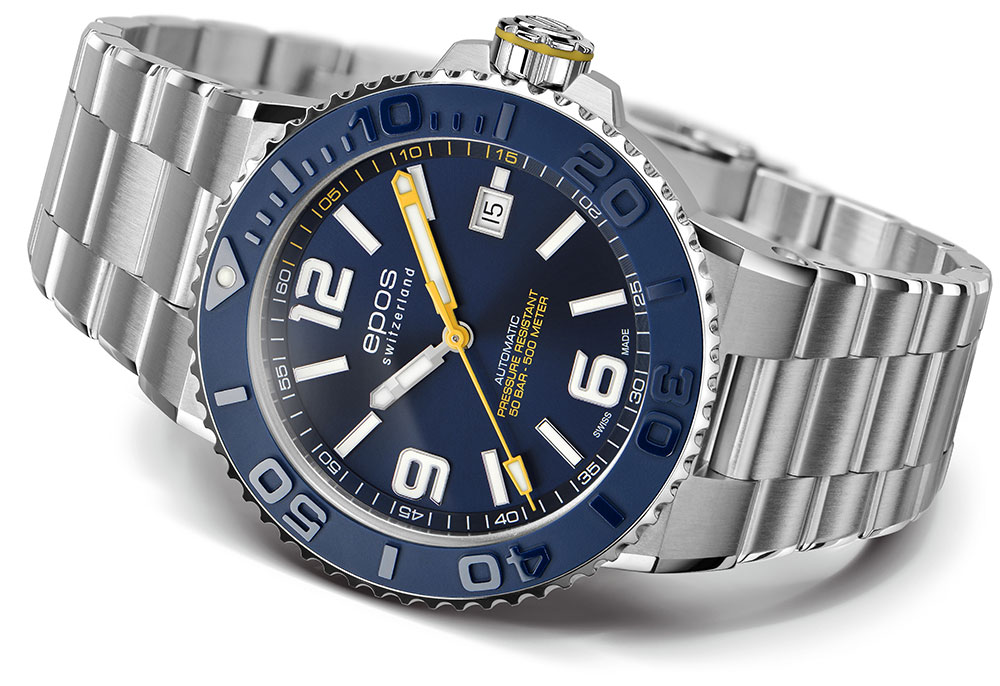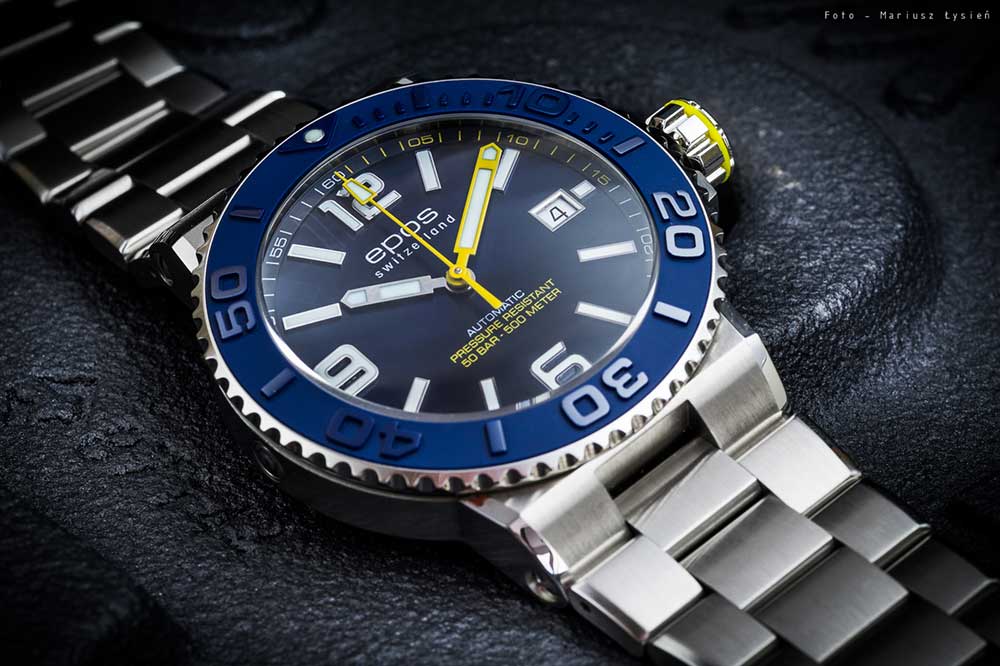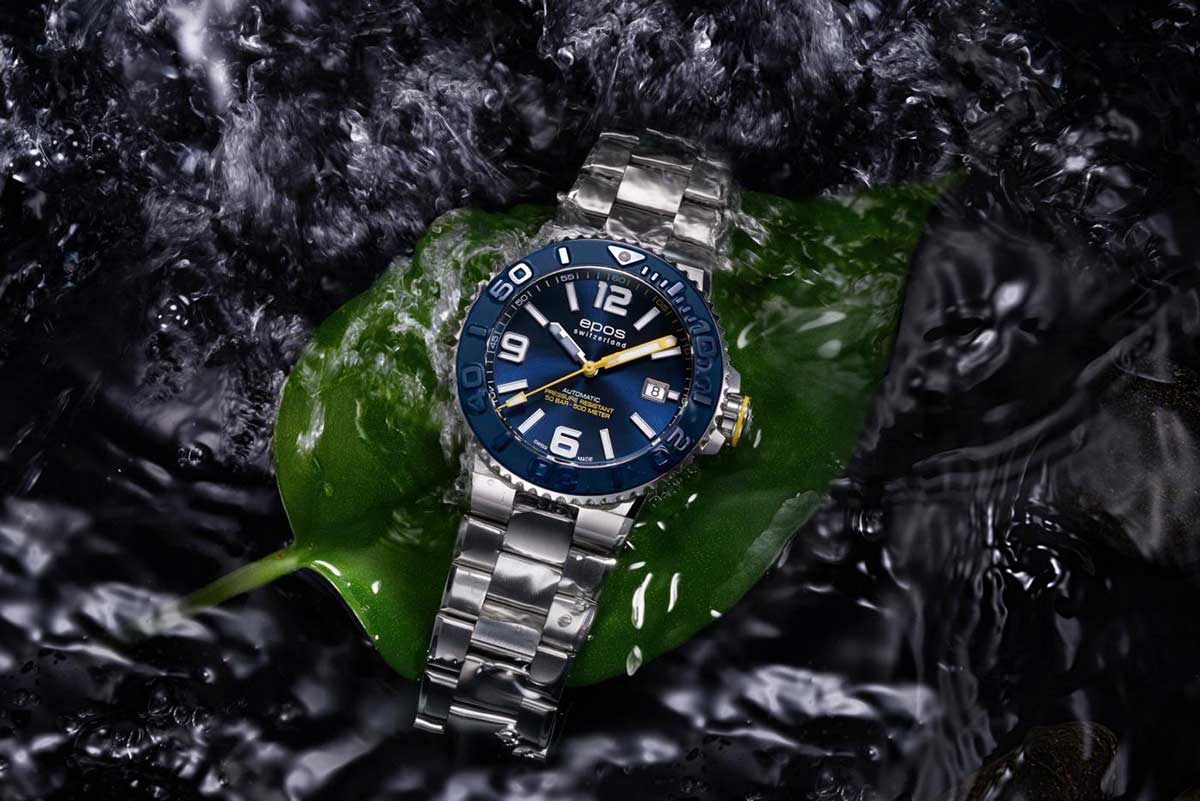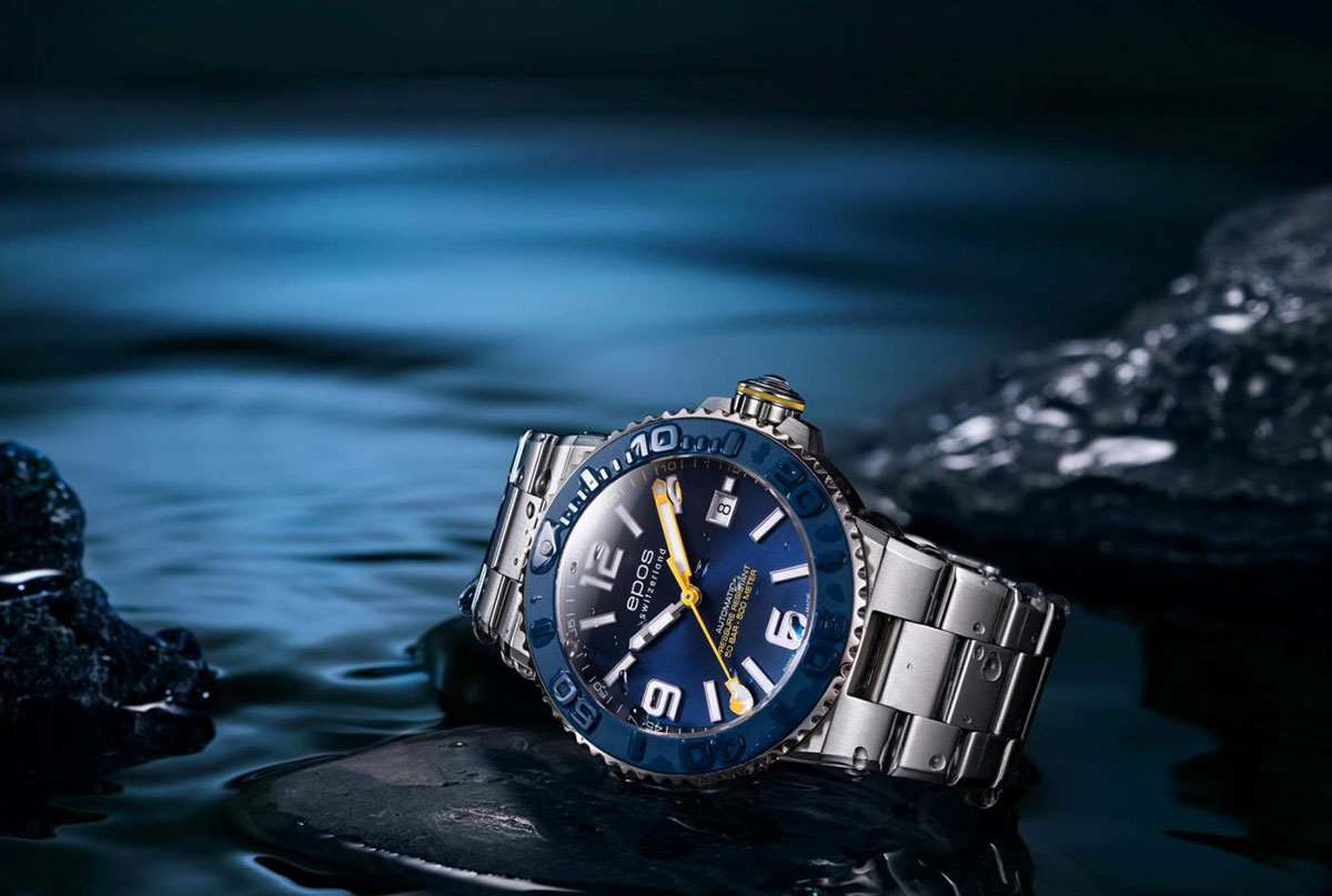 Špičkové diverské hodinky Epos Sportive Diver 3441.131.96.56.30, které splňují ty nejvyšší nároky diverského světa. Nově vyvinutý časovač ponoru má působivé funkce. Ve svém pouzdře poráží známý automatický Machineek ETA 2824. Inženýři Epos zvolili propracovaný design pouzdra se zakřiveným safírovým sklem. Vrcholem pouzdra je jednosměrně otočná keramická luneta. Hodinky jsou vybaveny heliovým ventilem a mají extrémně vysokou třídu těsnosti 50 bar/500 m.