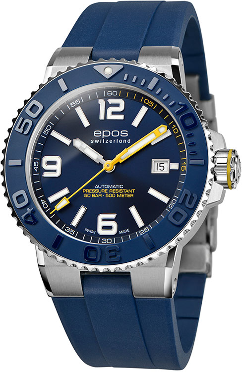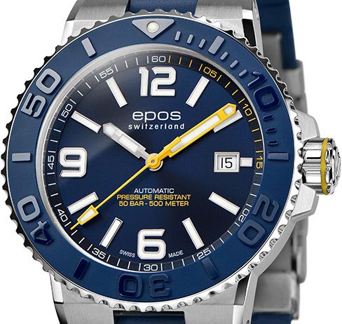 Špičkové diverské hodinky Epos Sportive Diver 3441.131.96.56.56, které splňují ty nejvyšší nároky diverského světa. Nově vyvinutý časovač ponoru má působivé funkce. Ve svém pouzdře poráží známý automatický Machineek ETA 2824. Inženýři Epos zvolili propracovaný design pouzdra se zakřiveným safírovým sklem. Vrcholem pouzdra je jednosměrně otočná keramická luneta. Hodinky jsou vybaveny heliovým ventilem a mají extrémně vysokou třídu těsnosti 50 bar/500 m.
