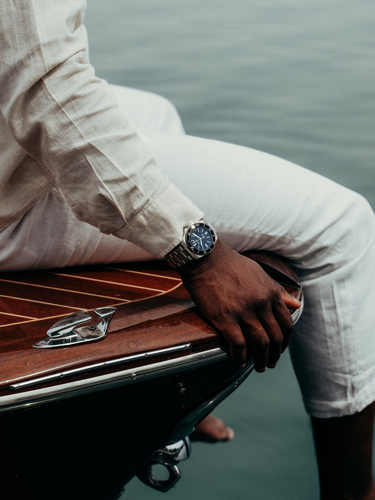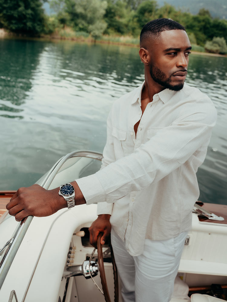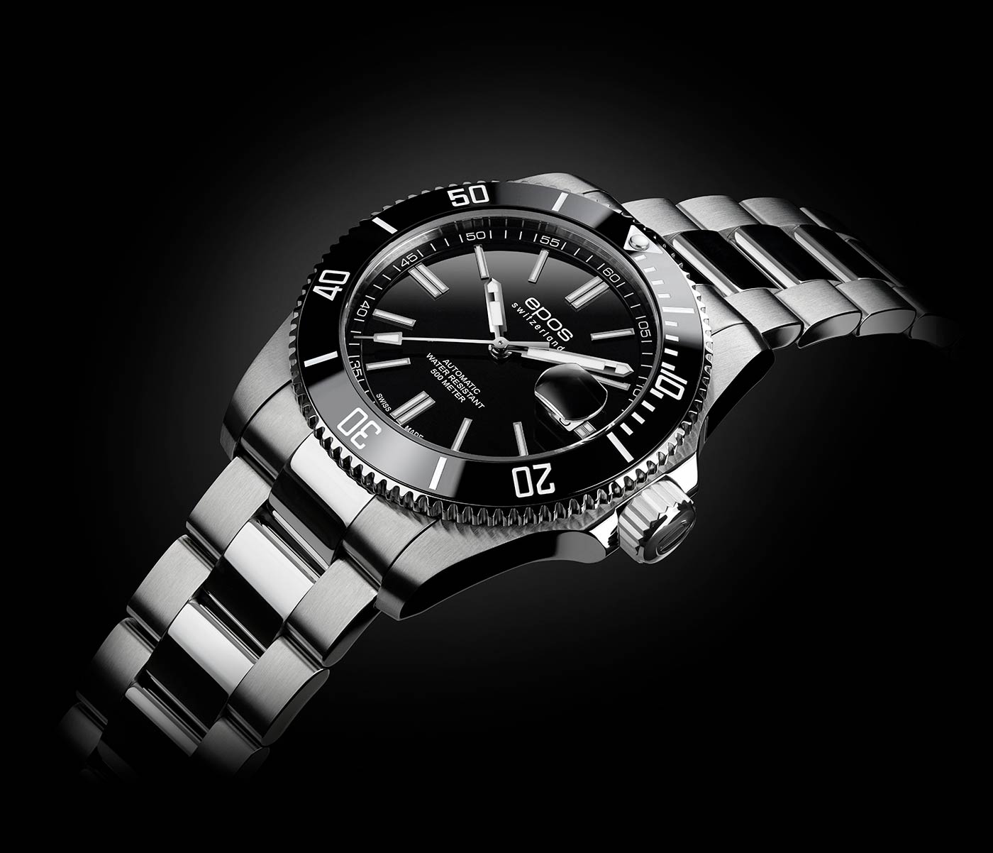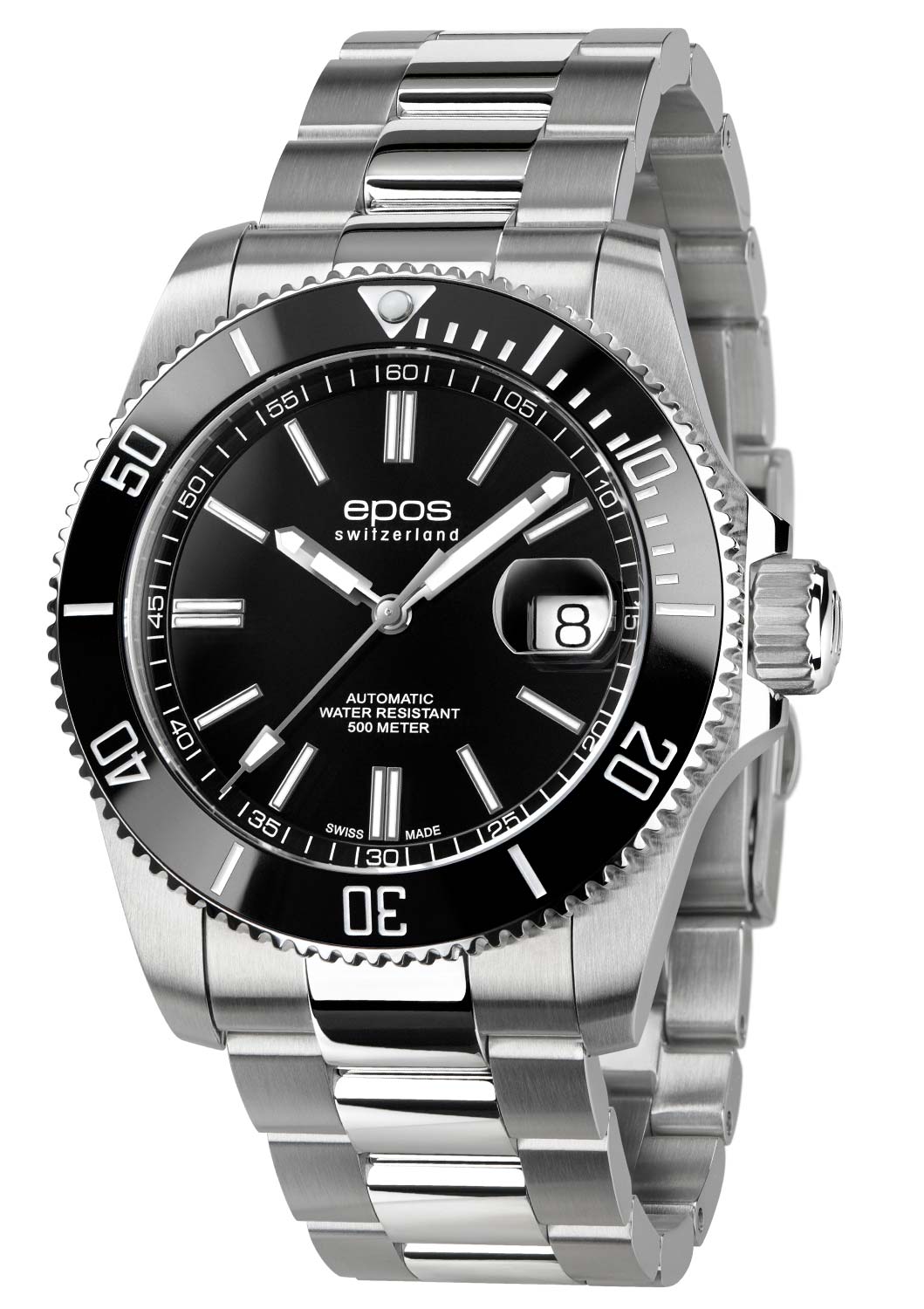 Epos Sportive Diver 3504.131.20.15.30 s černým otočným keramickým rámečkem, který obsahuje stupnici potřebnou pro výpočet času vynoření. Ocelové pouzdro o průměru 41,5 mm je utěsněno na 50 barů (50 atm, 500 m) a je vybaveno automatickým heliovým ventilem. Šroubovací korunka a zadní víčko s jemně vygravírovaným motivem potápěče. Vysoce kvalitní ocelový náramek se šroubovanými články a sponou, která se otevírá pomocí tlačítek, plus další prodloužení pro použití na neoprén. Imponující pětivrstvá antireflexní vrstva na odolném safírovém skle zajišťuje úžasnou čitelnost. Aby byla zajištěna čitelnost data i ve velkých hloubkách pod vodou, je integrována lupa. Srdcem hodinek je spolehlivý a osvědčený samočinný mechanismus Sellita SW200.