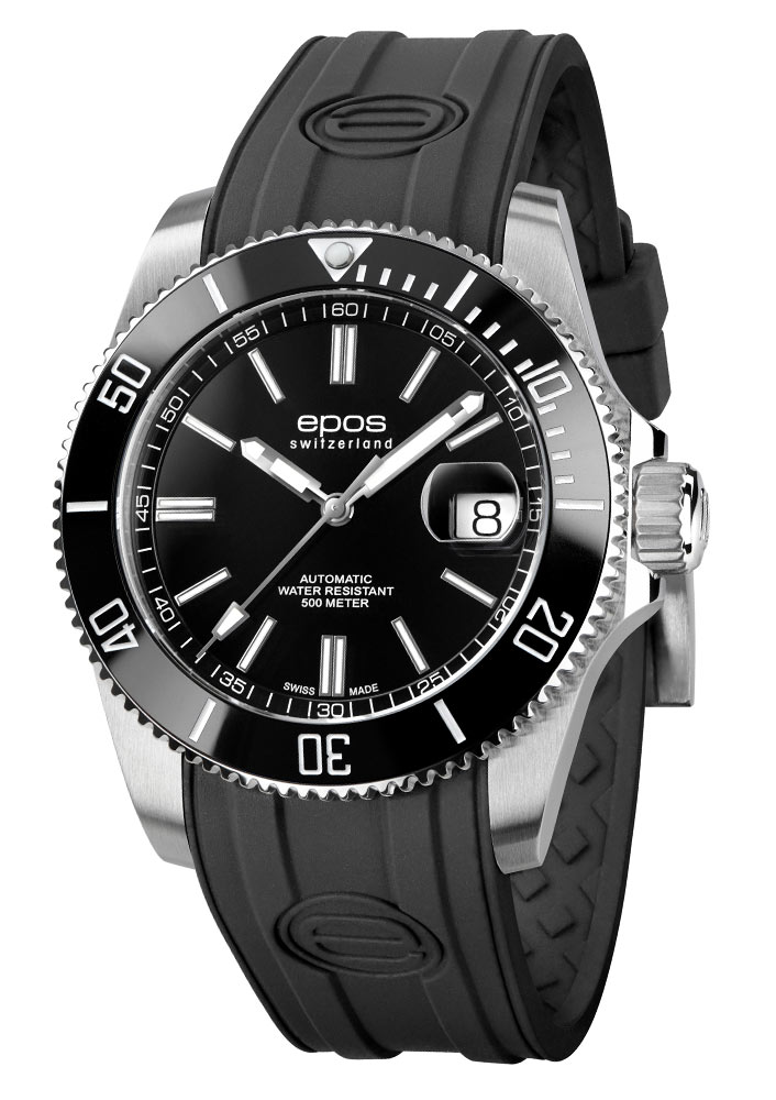 Epos Sportive Diver 3504.131.20.15.55 s černou otočnou keramickou lunetou, která má stupnici potřebnou pro výpočet doby výstupu. Použití keramiky dodává lesk a velmi ztěžuje poškrábání. Ocelové pouzdro o průměru 41,5 mm je utěsněno na 50 barů (50 atm, 500 m) a má automatický heliový ventil. Užitečné řešení, které umožňuje hodinkám automatickou dekompresi při vzestupu. Šroubovací korunka a zadní pouzdro se složitě rytým diverem. Kvalitní černý gumový pásek, lehký, voděodolný se speciální perforací na spodní straně, která zabraňuje pocení ruky při nošení v horkých dnech a odvádí vodu zpod pásku po vynoření. Působivá pětivrstvá antireflexní vrstva na safírovém sklíčku odolném proti poškrábání dodává neuvěřitelnou čitelnost. Aby bylo datum čitelné i ve velkých hloubkách pod vodou, je integrována lupa. Srdcem hodinek je spolehlivý a osvědčený samonatahovací mechanismus Sellita SW200 s rezervou chodu 38 hodin.