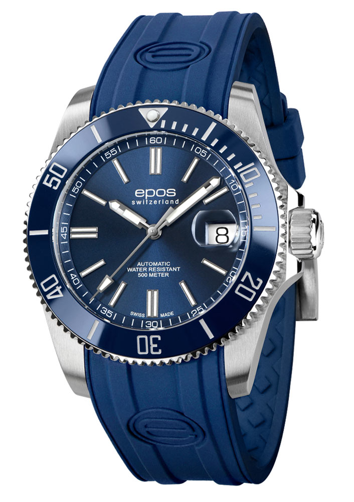 Epos Sportive Diver 3504.131.96.16.56 s modrou otočnou keramickou lunetou, která má stupnici potřebnou pro výpočet doby výstupu. Použití keramiky dodává lesk a velmi ztěžuje poškrábání. Ocelové pouzdro o průměru 41,5 mm je utěsněno na 50 barů (50 atm, 500 m) a má automatický heliový ventil. Užitečné řešení, které umožňuje hodinkám automatickou dekompresi při vzestupu. Šroubovací korunka a zadní pouzdro se složitě rytým diverem. Kvalitní modrý gumový pásek, lehký, voděodolný se speciální perforací na spodní straně, která zabraňuje pocení ruky při nošení v horkých dnech a odvádí vodu zpod pásku po vynoření. Působivá pětivrstvá antireflexní vrstva na safírovém sklíčku odolném proti poškrábání dodává neuvěřitelnou čitelnost. Aby bylo datum čitelné i ve velkých hloubkách pod vodou, je integrována lupa. Srdcem hodinek je spolehlivý a osvědčený samonatahovací mechanismus Sellita SW200 s rezervou chodu 38 hodin.