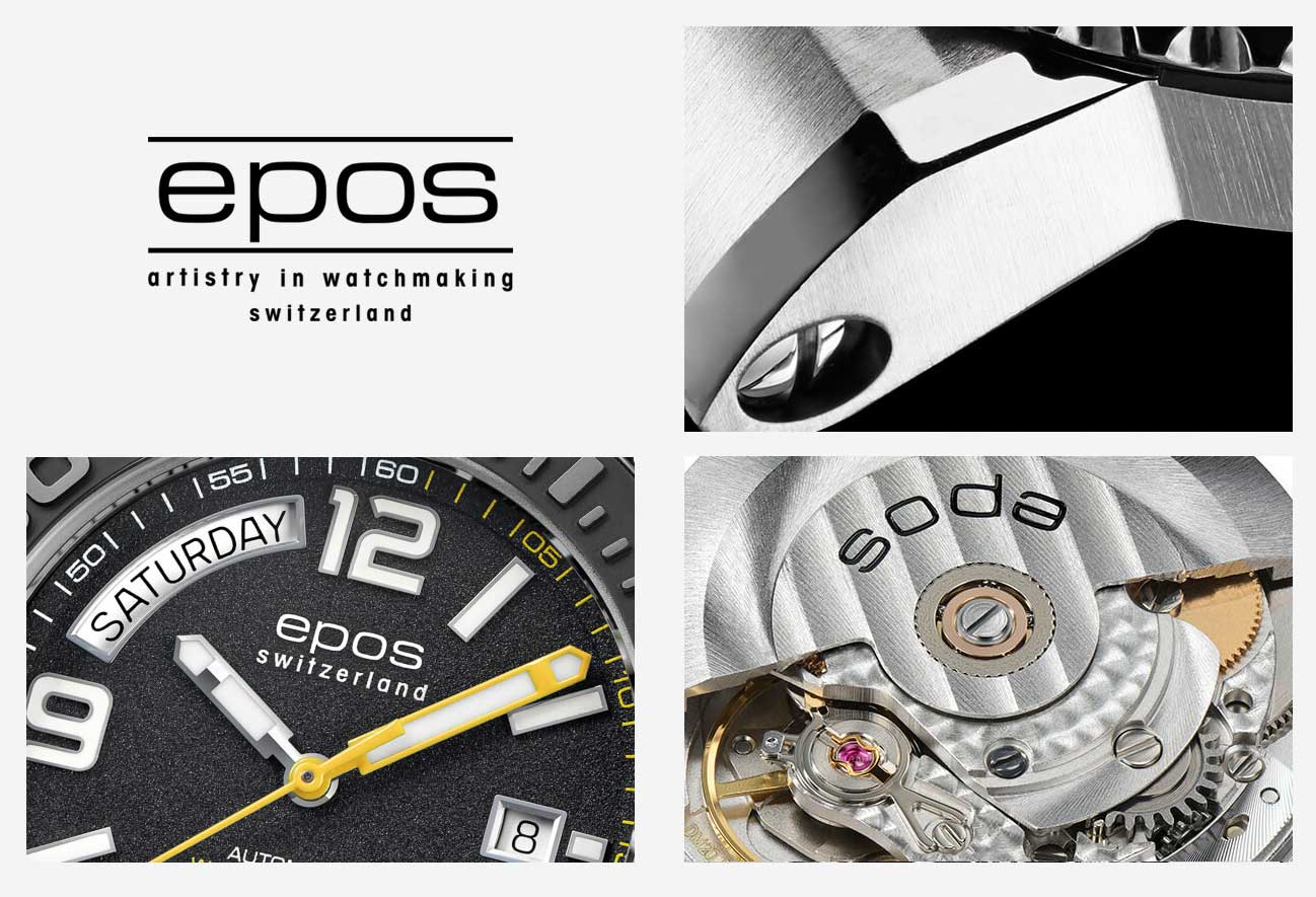 Epos Sportive Diver Day Date je vybavena skleněnými zády, díky kterým lze ze zadní strany obdivovat nádherně zdobený mechanismus. Černý pískovaný ciferník má ručně nanesené indexy, které jsou stejně jako ručičky pokryty luminiscenční hmotou. Nejnovější kolekce EPOS vychází vstříc potřebám milovníků prémiových mechanických sportovních hodinek, kteří hledají další funkce, jako je zobrazení dne v týdnu a zobrazení data.