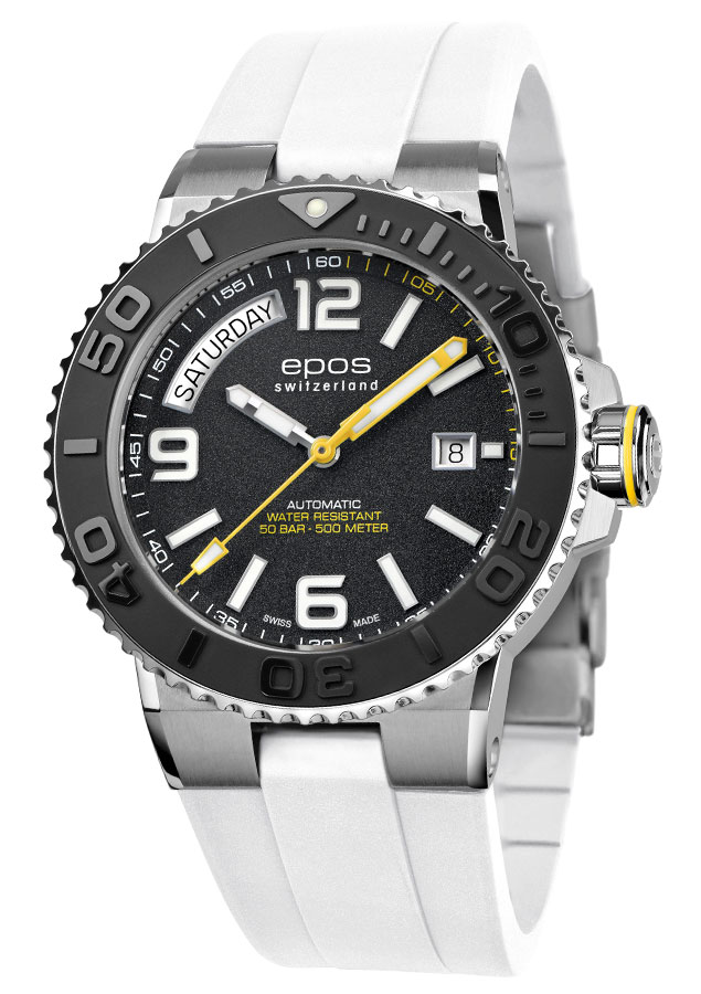 EPOS s hrdostí představuje sportovní diverské hodinky s dnem v týdnu. Sportive Diver Day Date 3441.142.20.95.50 Na základě velmi úspěšných špičkových diverských hodinek EPOS 3441 posouvá tento model řadu EPOS Diver na další úroveň.