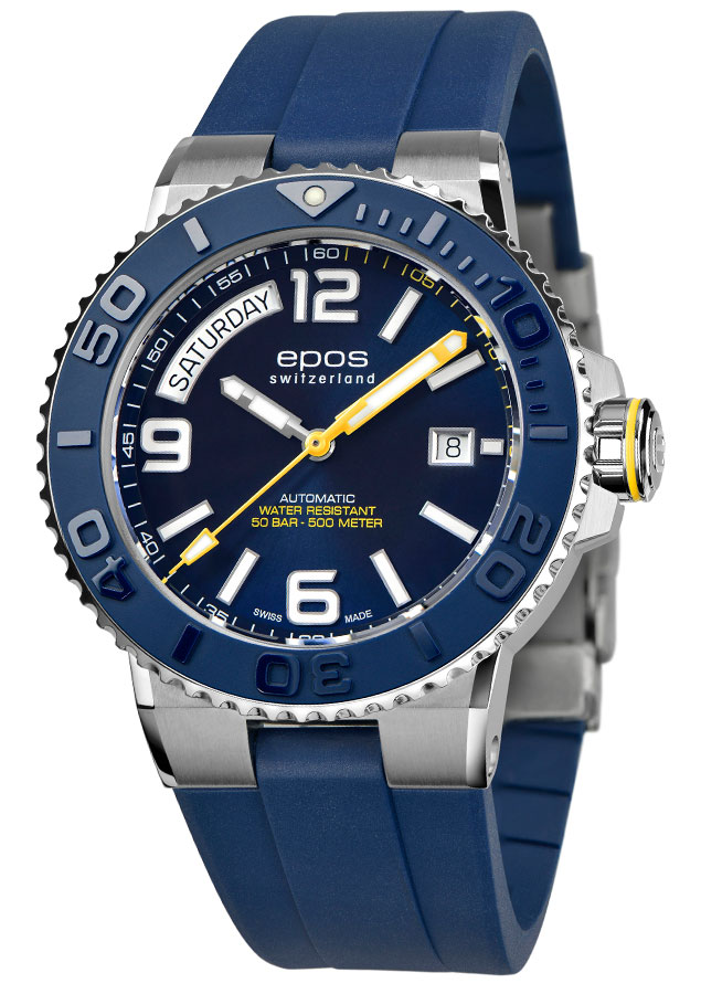Epos Sportive Diver Day Date je vybavena skleněnými zády, díky kterým lze ze zadní strany obdivovat nádherně zdobený mechanismus. Sluncem broušený modrý ciferník má ručně aplikované indexy, které jsou stejně jako ručičky pokryty luminiscenční hmotou. Nejnovější kolekce EPOS vychází vstříc potřebám milovníků prémiových mechanických sportovních hodinek, kteří hledají další funkce, jako je zobrazení dne v týdnu a zobrazení data.