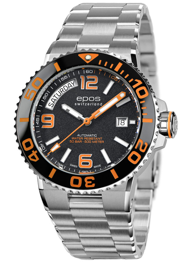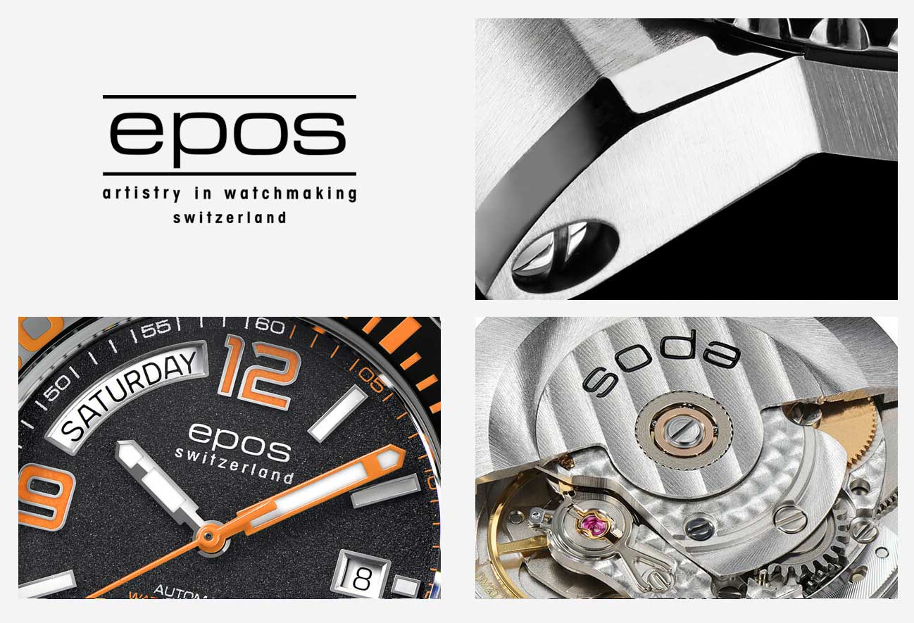Epos Sportive Diver Day Date je vybavena skleněnými zády, díky kterým lze ze zadní strany obdivovat nádherně zdobený mechanismus. Černý pískovaný ciferník má ručně nanesené indexy, které jsou stejně jako ručičky pokryty luminiscenční hmotou. Nejnovější kolekce EPOS vychází vstříc potřebám milovníků prémiových mechanických sportovních hodinek, kteří hledají další funkce, jako je zobrazení dne a data.