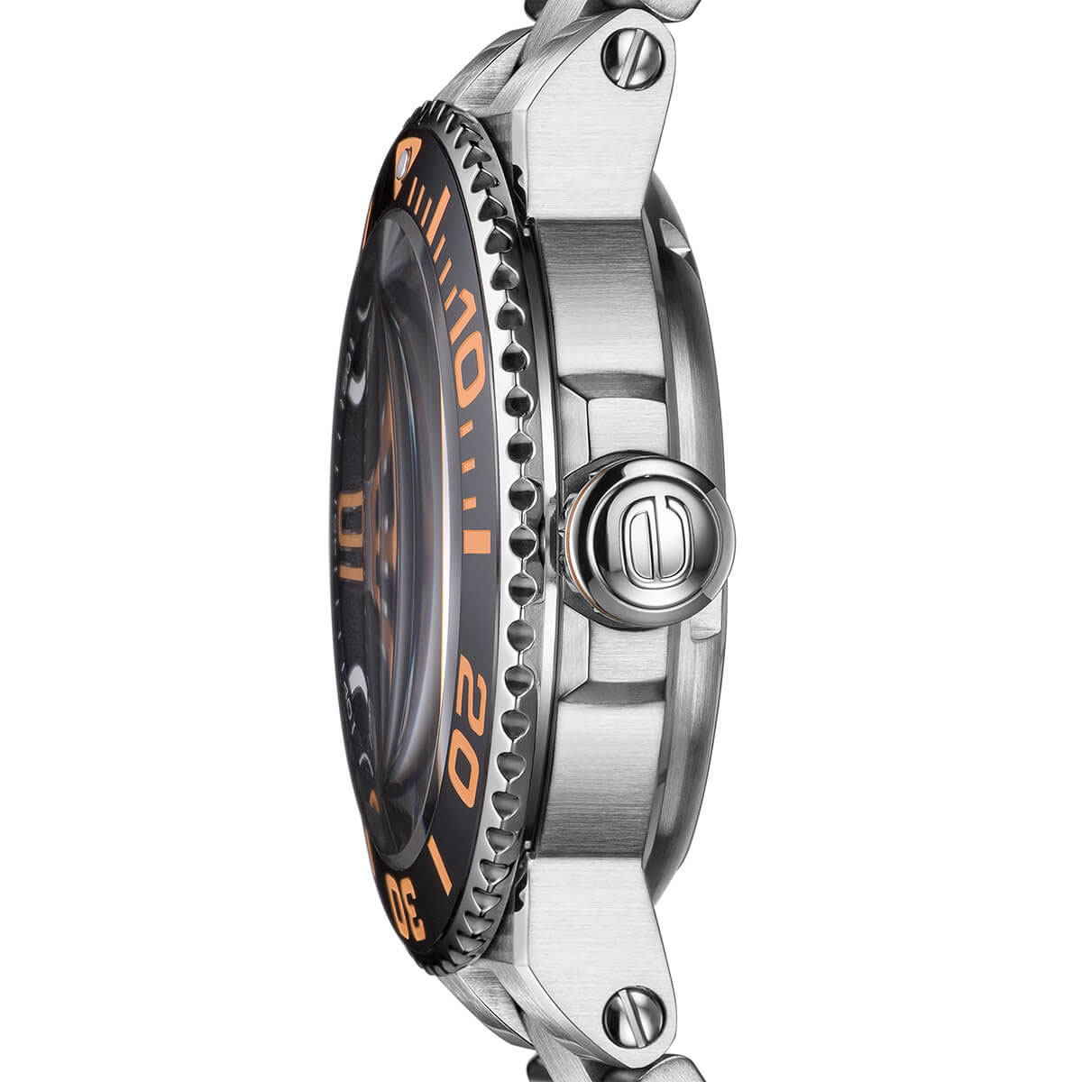Epos Sportive Diver Day Date je vybavena skleněnými zády, díky kterým lze ze zadní strany obdivovat nádherně zdobený mechanismus. Černý pískovaný ciferník má ručně nanesené indexy, které jsou stejně jako ručičky pokryty luminiscenční hmotou. Nejnovější kolekce EPOS vychází vstříc potřebám milovníků prémiových mechanických sportovních hodinek, kteří hledají další funkce, jako je zobrazení dne v týdnu a zobrazení data.