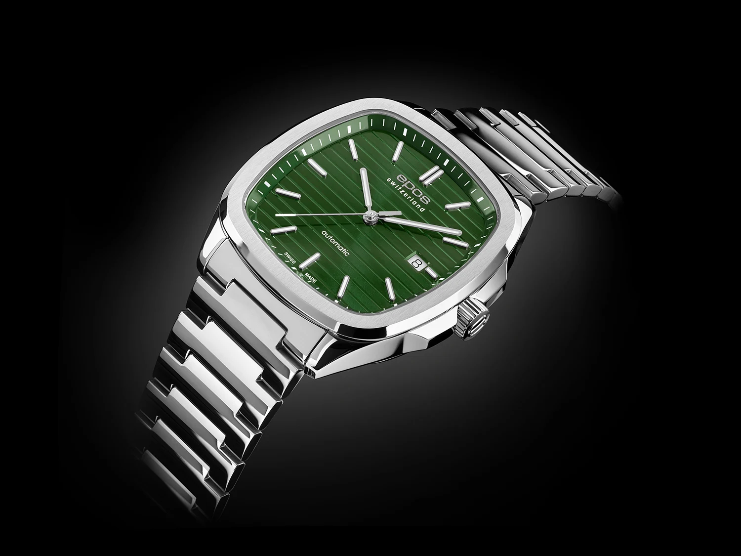Pánské hodinky Epos Timeless 3511.152.20.13.30 jsou volbou pro ty, kteří mají rádi eleganci spojenou s charakterem současné formy. Čtvercové hodinky Epos na ocelovém náramku se na první pohled vyznačují intenzivně zeleným ciferníkem s horizontální giloší, která jim dodává dynamický a svěží výraz. Jsou to švýcarské automatické hodinky spojující precizní zpracování s moderní estetikou propracovanou do každého detailu.