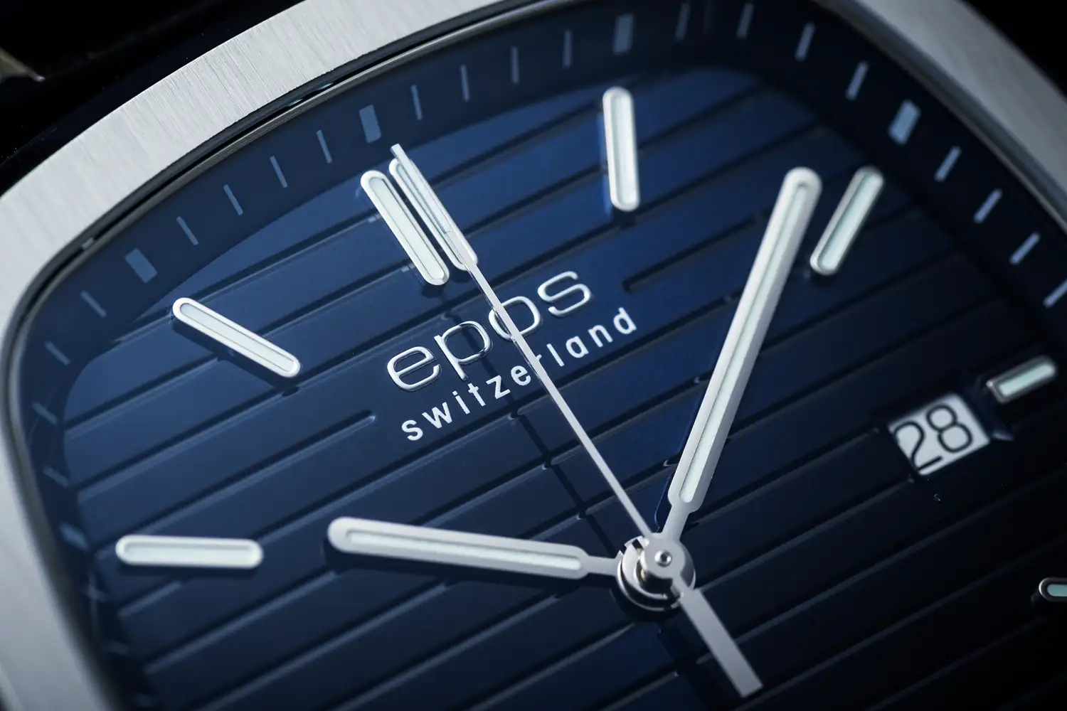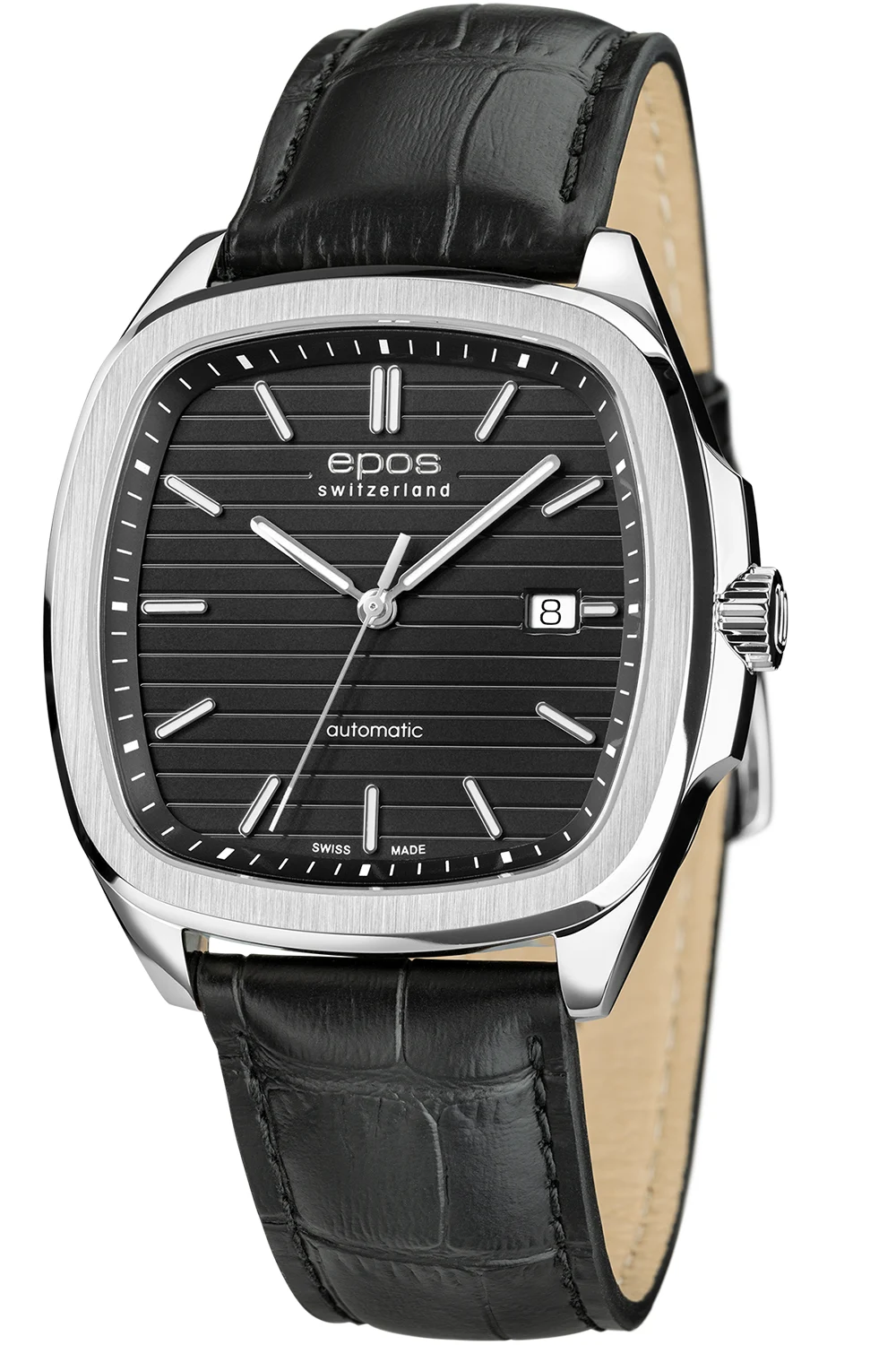V centru konstrukce pracuje zdobený mechanismus Sellita SW300, viditelný přes prosklené víko. Jde o ceněný, přesný kalibr Swiss Made, který definuje charakter hodinek Epos jako spolehlivého společníka na léta. Model je usazen na černém koženém řemínku s ražením, zakončeném elegantní motýlovou přezkou. Díky výšce pouzdra pouhých 8.65 mm se hodinky pohodlně vejdou pod manžetu a jejich proporce vytvářejí nadčasovou estetiku.