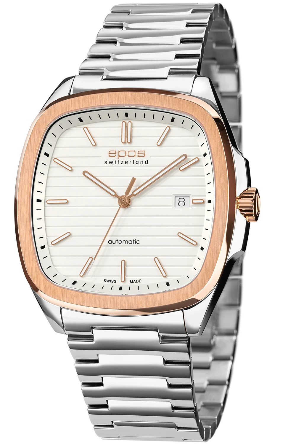 Pánské hodinky Epos Timeless 3511.152.34.10.30 představují eleganci v moderním pojetí, spojující klasický design se švýcarskou precizností. Čtvercové pouzdro v ocelovo-růžovém tónu upoutá pozornost jemným zpracováním a světlý ciferník s horizontální giloší zdůrazňuje charakter těchto automatických hodinek.