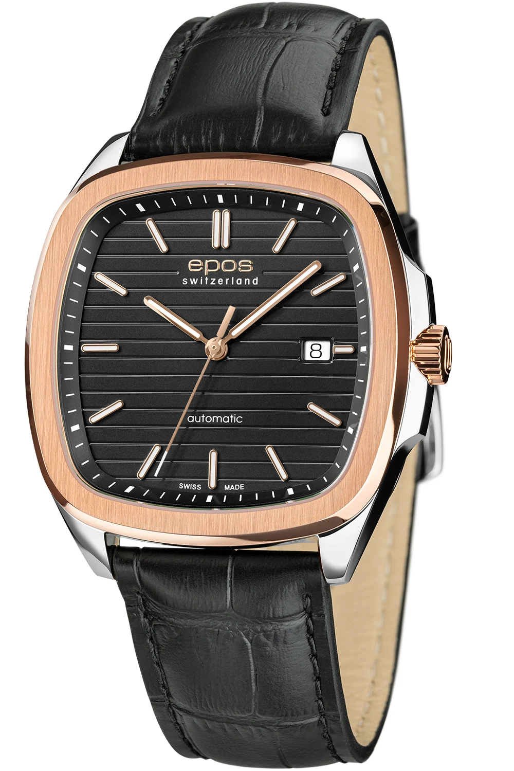 Pouzdro o velikosti 40 × 40 mm získalo efektní růžově zlatý akcent, který ladí s černým řemínkem z přírodní kůže. Díky štíhlému profilu se hodinky skvěle usazují na zápěstí a bez potíží se vejdou pod manžetu košile, což z nich činí ideální společenské hodinky. Uvnitř pracuje precizní automatický strojek Swiss Made, nabízející plynulý chod ruček a spolehlivost při každodenním používání. Ciferník je vybaven datumovkou a indexy i ručky jsou provedeny v barvě růžového zlata.