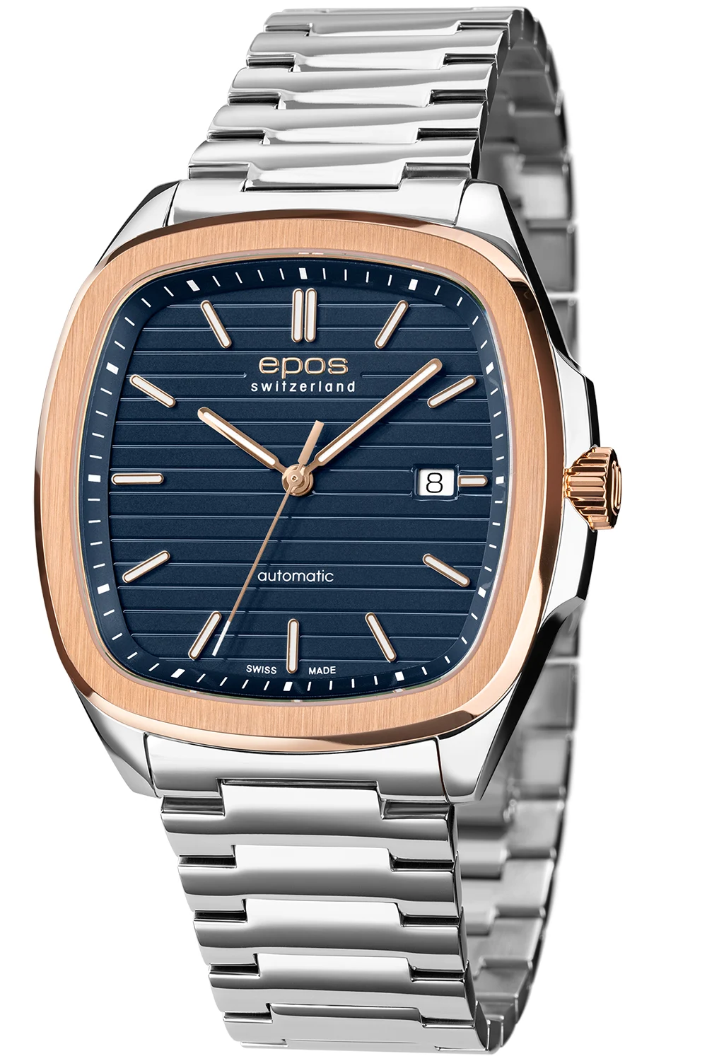 Epos Timeless 3511.152.34.16.30 jsou švýcarské automatické hodinky pro muže, kteří si cení elegance v moderním provedení. Čtvercové pouzdro o šířce 40 mm, spojené s růžově zlatým rámečkem a ocelovým náramkem, vytváří harmonický design ideální pro každodenní i formální stylizace.