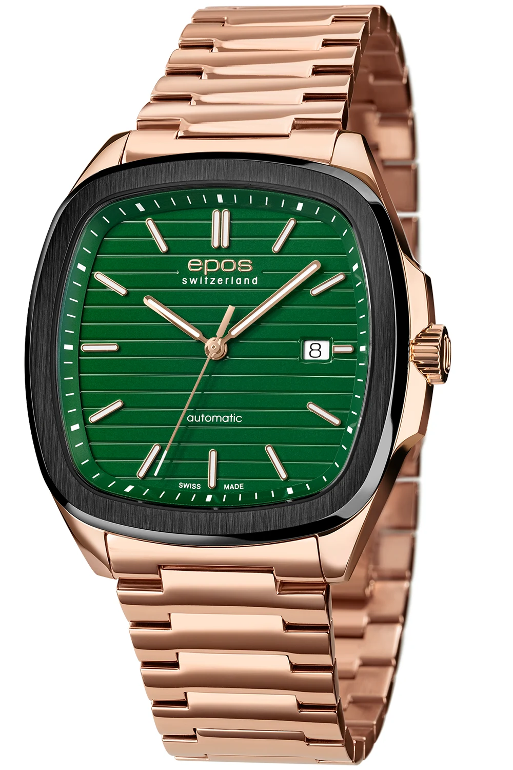 Hluboká zelená barva ciferníku s horizontálními reliéfy dodává modelu dynamický charakter a indexy a ručky s luminiscencí zajišťují čitelnost za všech podmínek. Automatické hodinky Epos byly vybaveny strojkem Sellita SW300, viditelným přes prosklené víko, což představuje dodatečnou hodnotu pro milovníky švýcarského řemesla.
