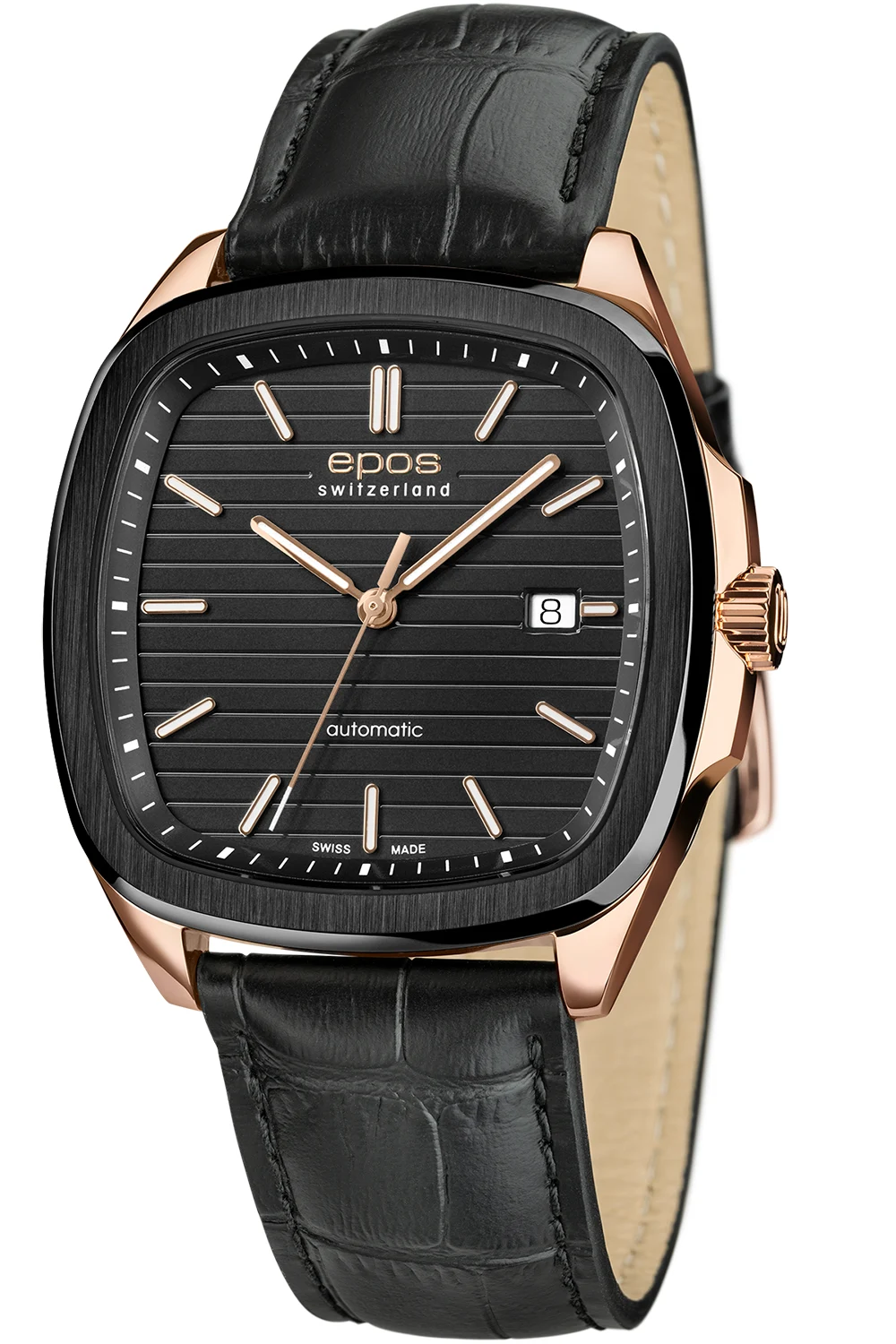Pánské hodinky Epos Timeless 3511.152.55.15.25 jsou návrhem pro muže, kteří hledají eleganci v moderním provedení. Čtvercové hodinky Epos vynikají spojením růžového zlata, hluboké černé a klasické estetiky švýcarských automatických hodinek.