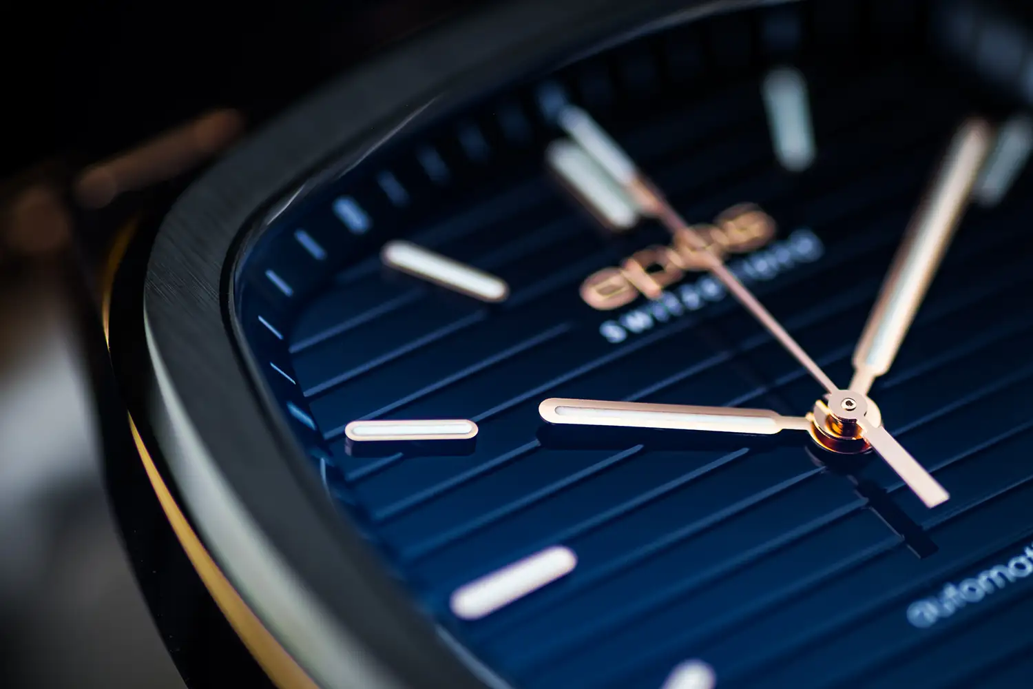 Číselník v černé barvě s vodorovným zdobením prezentuje minimalistické indexy a ručky v odstínu růžového zlata. Použitá luminiscenční vrstva zlepšuje jejich čitelnost po setmění a datumovka na třetí hodině doplňuje kompozici. Pod prosklením pracuje precizní automatický strojek Sellita SW300, jehož chod lze pozorovat přes průhledné víko – to je jeden z prvků, který mnoho nadšenců oceňuje na mechanických hodinkách.