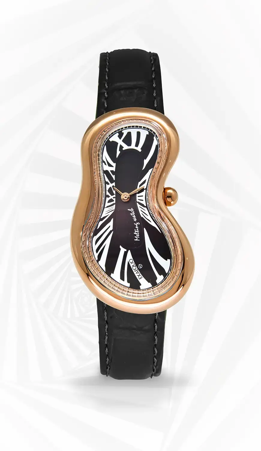 Surrealistické pozlacené hodinky typu Melted Watch značky Exaequo doplňuje pásek s krokodýlím vzorem, jenž podtrhuje eleganci designu. Vyroben z nejkvalitnější kůže, pásek má tónové švy a pohodlné sponové zapínání. Model Melting Watch PVDRG SS 316L Black HS Code 9102.11.65 není jen časoměr, ale i pocta myšlence plynoucího, subjektivního času, který může být deformován a ovlivněn lidským vnímáním. Design odráží pomíjivou podstatu života a křehkost existence, přičemž zkoumá surrealistický svět snů a podvědomí, který zpochybňuje racionální zákony a společenské konvence. Tající hodinky Exaequo Melting Watch PVD Rose Gold Black elegantně spojují styl, kulturu a hlubokou reflexi nad podstatou času a reality.