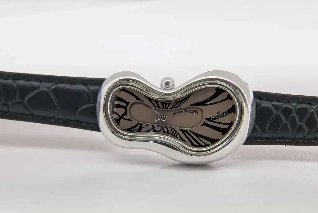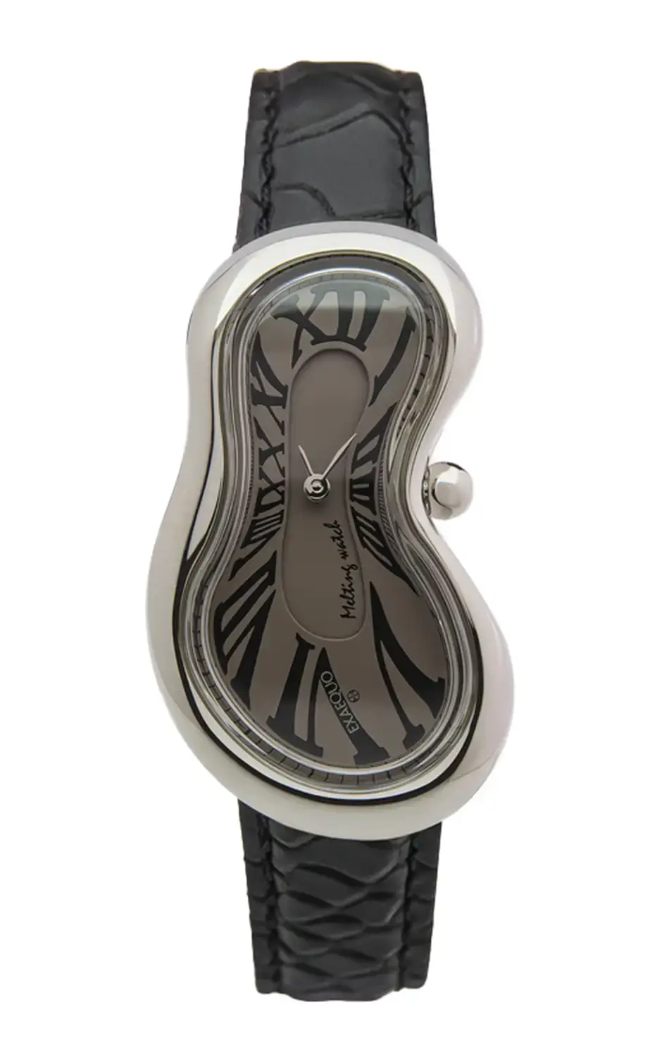 Černý kožený pásek s texturou připomínající hadí kůži je částečně obšitý látkou, což mu dodává originalitu a hmatovou hloubku. Exaequo Melting Watch Silver Fumé nejsou jen elegantní tající hodinky – jsou uměleckým manifestem, který překračuje hranice tradičního designu. Ideální pro sběratele, milovníky umění a všechny, kdo hledají nevšední způsob, jak vyjádřit svůj styl.