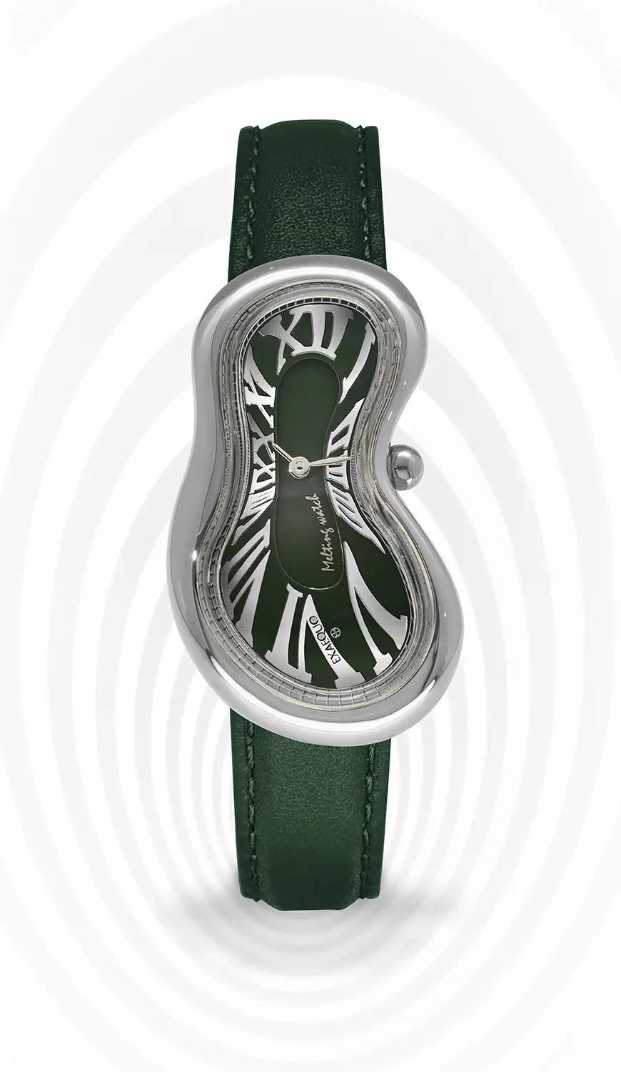 Tento neobyčejný model, patřící do exkluzivní skupiny "melting watches", vyniká asymetrickým pouzdrem s plynulými liniemi, vyrobeným z kvalitní nerezové oceli 316L s matným povrchem. Pouzdro o délce přibližně 47 mm a maximální šířce přibližně 28 mm má oválný tvar se zploštělým středem a zaoblenou korunkou na pravé straně, která usnadňuje nastavení času. Tento design odkazuje na legendární motiv topnícího času, symbolizující křehkost a efemérnost života. Dvouvrstvá ciferník hodinek Exaequo Softwatch uchvacuje hlubokým odstínem zelené, který dokonale ladí s vybouleným sklem z plastu. Stylové římské číslice a kontrastující indexy harmonizují s neobvyklým tvarem pouzdra, čímž vytvářejí atmosféru surrealistického snu. Model Exaequo EX0001.0005 je k dispozici v ocelovém provedení, v němž se nachází precizní mechanismus Ronda Far East 751, umožňující snadnou výměnu baterie a nabízí vodotěsnost na úrovni přibližně 30 metrů. Zadní strana pouzdra byla navržena s ohledem na personalizaci, což činí tento hodinky ideálním dárkem pro milovníky designu.