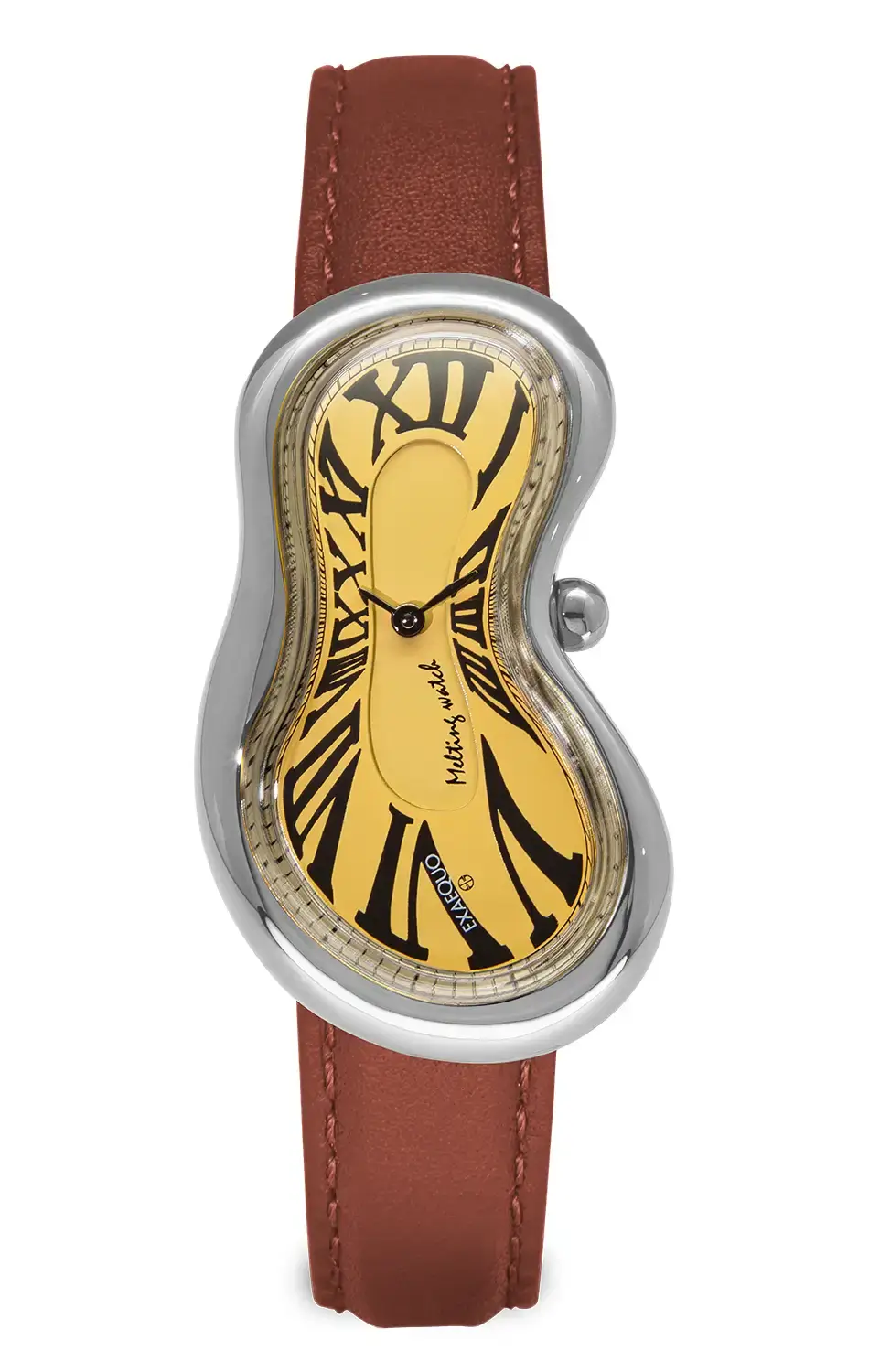 Dokončením surrealistických hodinek typu Melted Watch značky Exaequo je pásek s hladkou texturou, který dokonale podtrhuje eleganci projektu. Vyrobený z nejkvalitnější kůže, pásek má tonální prošívání a pohodlné zapínání na sponu. Model Melting Watch SS 316L Yellow HS Code 9102.11.65 je nejen časoměr, ale také pocta myšlence tekutého, subjektivního času, který může být deformován a manipulován lidskou percepcí. Projekt odráží pomíjivou povahu života a křehkost existence, zároveň zkoumá surrealistický svět snů a nevědomí, který zpochybňuje racionální zákony a sociální konvence. Topnějící hodinky Exaequo Melting Watch Silver Yellow s grácií spojují styl, kulturu a hlubokou reflexi nad podstatou času a reality.