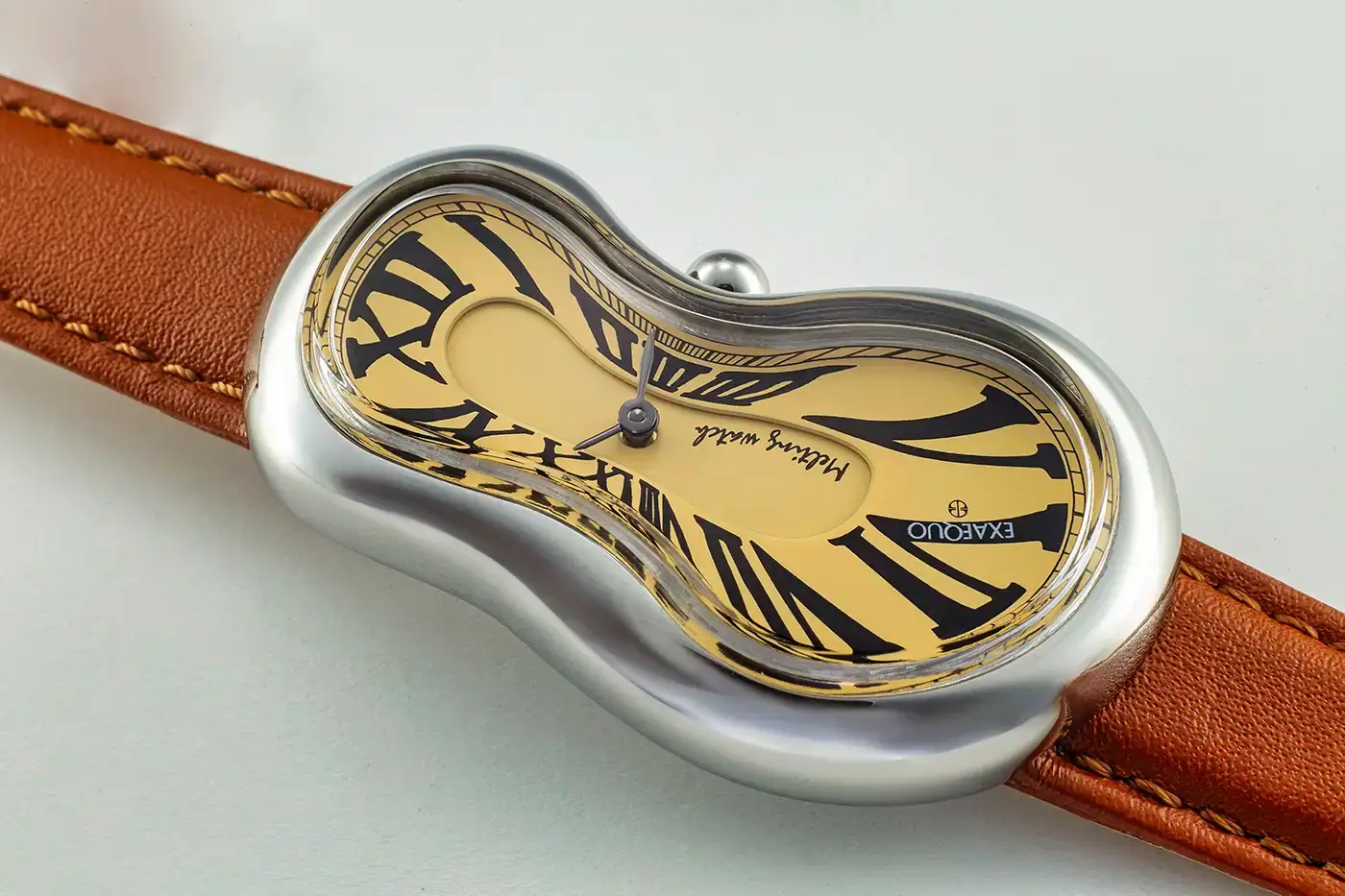 Tento neobyčejný model, patřící do exkluzivní skupiny „melting watches”, se vyznačuje asymetrickým pouzdrem s plynulými liniemi, vyrobeným z vysoce kvalitní nerezové oceli 316L se saténovým povrchem. Pouzdro o délce přibližně 47 mm a maximální šířce přibližně 28 mm má oválný tvar sploštělý uprostřed a zaoblenou korunku na pravé straně, která usnadňuje nastavení času. Tento design odkazuje na ikoničtě motív topnějícího času, symbolizující křehkost a pomíjivost života. Dvouvrstvá číselník hodinek Exaequo Softwatch uchvátí zlatavě žlutým odstínem, který dokonale ladí s vybouleným sklem z plastu. Stylové římské číslice a kontrastní indexy harmonizují s netradičním tvarem pouzdra, vytvářejí atmosféru surrealistického snu. Model Exaequo EX0001.0003 je k dispozici v provedení s pouzdrem v barvě oceli, v němž se nachází precizní mechanizmus Ronda Far East 751, který umožňuje snadnou výměnu baterie a nabízí vodotěsnost na úrovni přibližně 30 metrů. Zadní strana pouzdra byla navržena s ohledem na personalizaci, což činí tento hodinky ideálním dárkem pro milovníky designu.