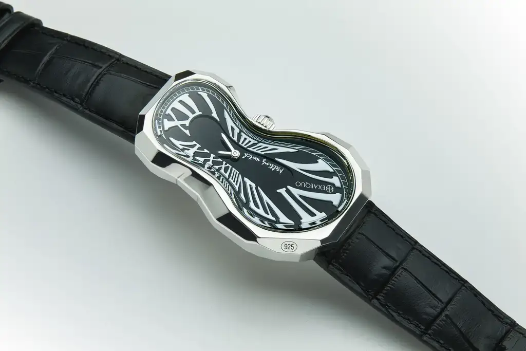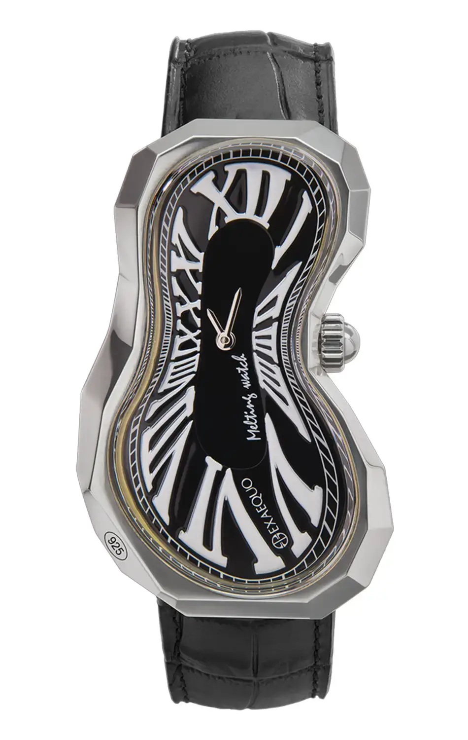 Limitované tající hodinky Exaequo Polyhedron 925 Melting Watch Black EX0101.0001 jsou manifestem užitého umění, který okouzluje odvážným přístupem k formě a detailu. Charakteristické, nepravidelné pouzdro ze stříbra ryzosti 925 — ručně zpracované s 62 fasetami — představuje reinterpretaci kultovního modelu Exaequo Classic, tentokrát ještě výraznějšího a umělecky vyspělejšího. Trojrozměrné pouzdro o rozměrech 48,6 × 25,55 mm ukrývá jedinečný ciferník krytý minerálním sklem, na kterém se černé římské číslice deformují ve stylu surrealismu.