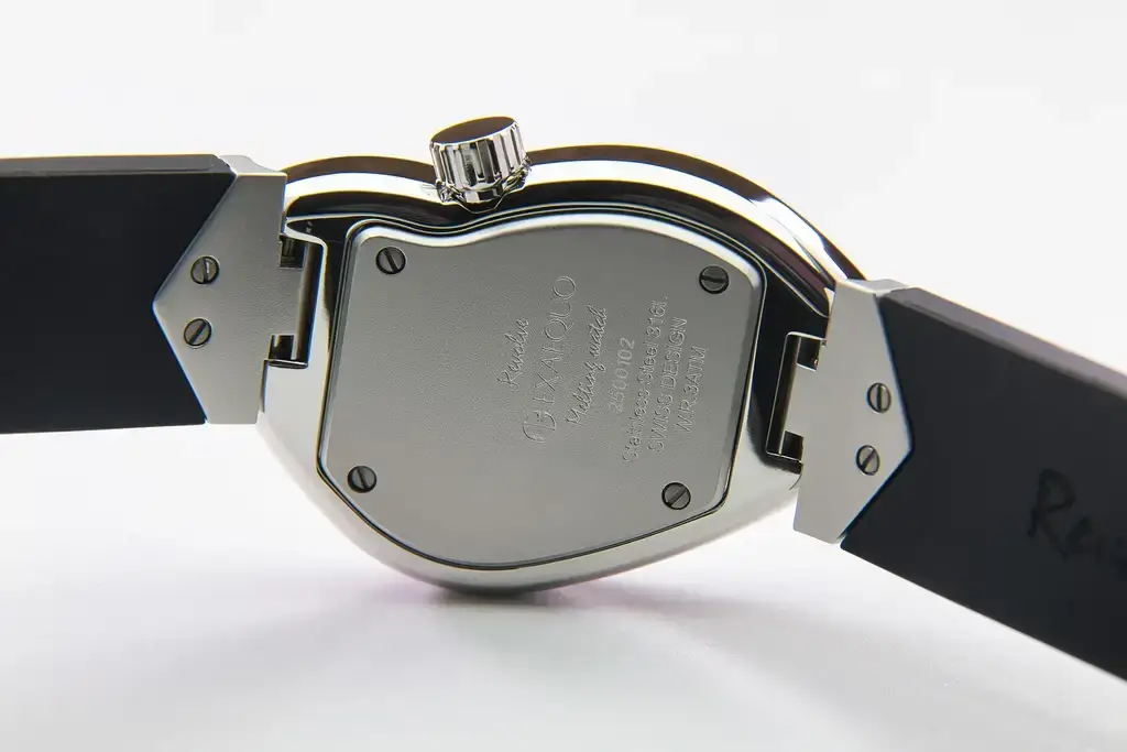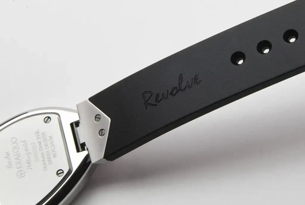 Na rozdíl od předchozích modelů značky, které se vyznačovaly plynulými, téměř „rozteklými“ liniemi pouzder, zde máme co do činění s výraznějším tvarem. Křivky jsou ostřeji definované, objevují se ostré úhly a důrazněji zaoblené hrany. Jde o pouzdro, které má svou vlastní geometrii, svůj výraz a… svůj pohyb. Revolve – tedy „otáčet se“, „kroužit“ – získává plný význam ve chvíli, kdy se zápěstí pohne: otočené pouzdro se proměňuje v tvar připomínající surrealistické rty. Je to nečekaný, a přitom hravý efekt – pocta mechanice pohybu i emocionální stránce designu. Matný černý číselník s indexy plněnými olejem a ručkami s černou luminiscencí vzdává hold estetice na pomezí umění a avantgardy.