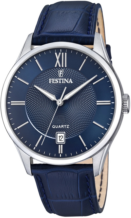 Klasické pánské hodinky Festina 20426/2 s elegantním pouzdrem a koženým řemínkem. Průměr 43 mm znamená, že hodinky padnou každé mužské ruce a malá tloušťka vám umožní je snadno schovat pod manžetu košile. Za pozornost stojí především krásný modrý ciferník, který je uprostřed zdoben elegantním vzorem a na jeho okrajích jsou římské indexy.