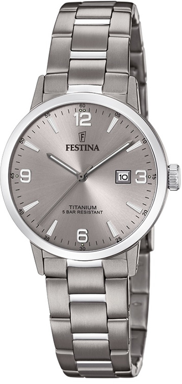 Dámské hodinky, pouzdro a náramek Festina 20436/2 Titanium jsou vyrobeny z titanu. Tento úžasný materiál je hypoalergenní, lehký a příjemný na nošení. Určeno pro ženy, které hledají odolné hodinky, které díky své hmotnosti nebudou překážet při každodenních činnostech. Design Festina Titanium je předurčuje k elegantní reakci i ke každodennímu oblečení. Šedý ciferník je čitelný, doplňková funkce data a třída těsnosti 5 barů.