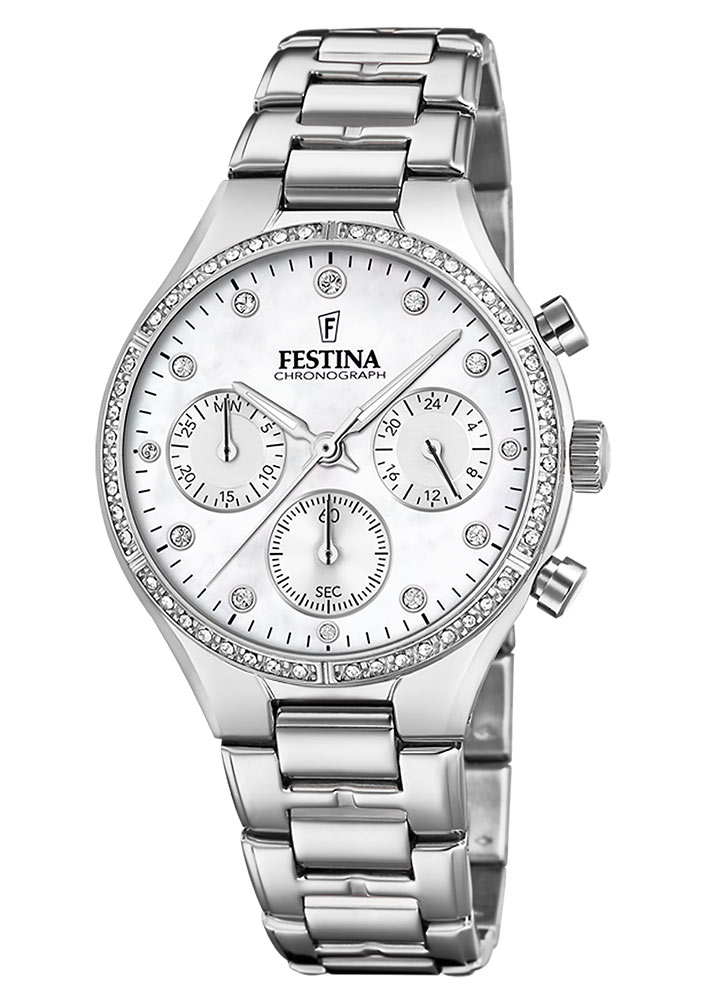Značka hodinek Festina nabízí bohatý výběr módních dámských hodinek a prezentované bižuterní sportovní hodinky se skvěle hodí do této kolekce. Festina Boyfriend Chronograph F20401/1 je kvartový chronograf s průměrem 36 mm, vytvořený s ohledem na ženy, které ocení sportovní vzhled a funkcionalitu v elegantním provedení. Ozdobený lesklou perlovou hmotou a bohatým množstvím zirkonů, vyrobený z nejkvalitnějších materiálů, jako je odolná nerezová ocel a odolné minerální sklo, a vybavený nerezovým řetízkem, který zajišťuje trvanlivost a eleganci.