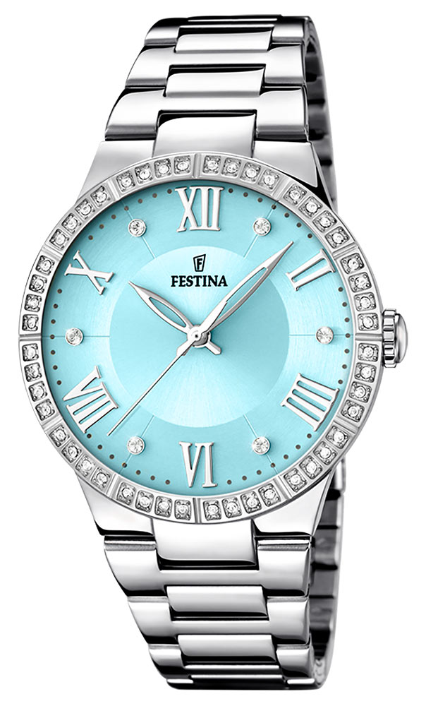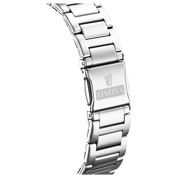 Ciferník je chráněn minerálním sklíčkem, které je odolné proti rozbití. Křišťálové hodinky Festina jsou vybaveny třířadým náramkem, který je rovněž vyroben z nerezové oceli. Díky zužující se šířce článků od oček pouzdra směrem k motýlkové sponě se však vyznačuje velmi ženskou siluetou.