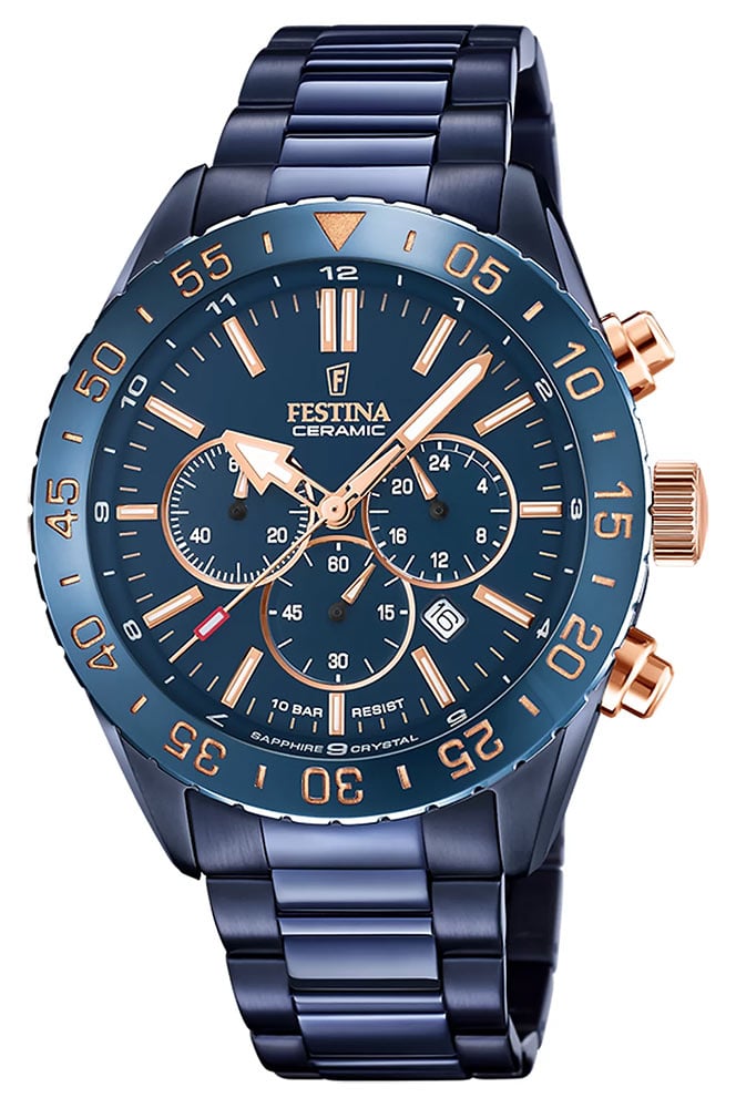 Festina Ceramic jsou sportovní hodinky z PVD nerezové oceli a barevné keramiky s chronografem a datumovkou. Vysoká preciznost zpracování a pečlivý design v luxusních barvách z nich dělají perfektní pánské hodinky na každý den. Perfektní model na nošení jak na trénink, tak na formálnější příležitosti.