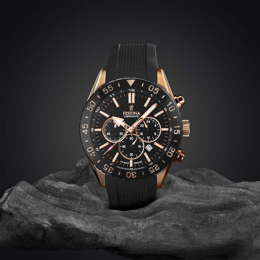 Luneta hodinek je vyrobena z odolné, odolné proti poškrábání a především opravdu stylové černé pigmentové keramiky, která slouží jako základ pro funkční, vnější minutovou stupnici. Celý číselník, viditelný v noci díky luminiscenční hmotě uprostřed indexů a indikací, je chráněn průhledným a ultraodolným safírovým sklíčkem. Tento materiál díky své vysoké tvrdosti poskytne vynikající ochranu proti poškrábání. Roli pouzdra plní 44mm pouzdro odlité z vysoce kvalitní nerezové oceli, které navíc zaručuje ochranu proti zašednutí a mechanickému poškození. Jeho fasáda je tvořena jak kartáčovanými, tak leštěnými texturami, zvýrazněnými růžovým zlatem. Právě v ní je mimo jiné vidět kompilační plynulost, návrhářská smělost a smysl pro módu, kterými je Festina proslulá.