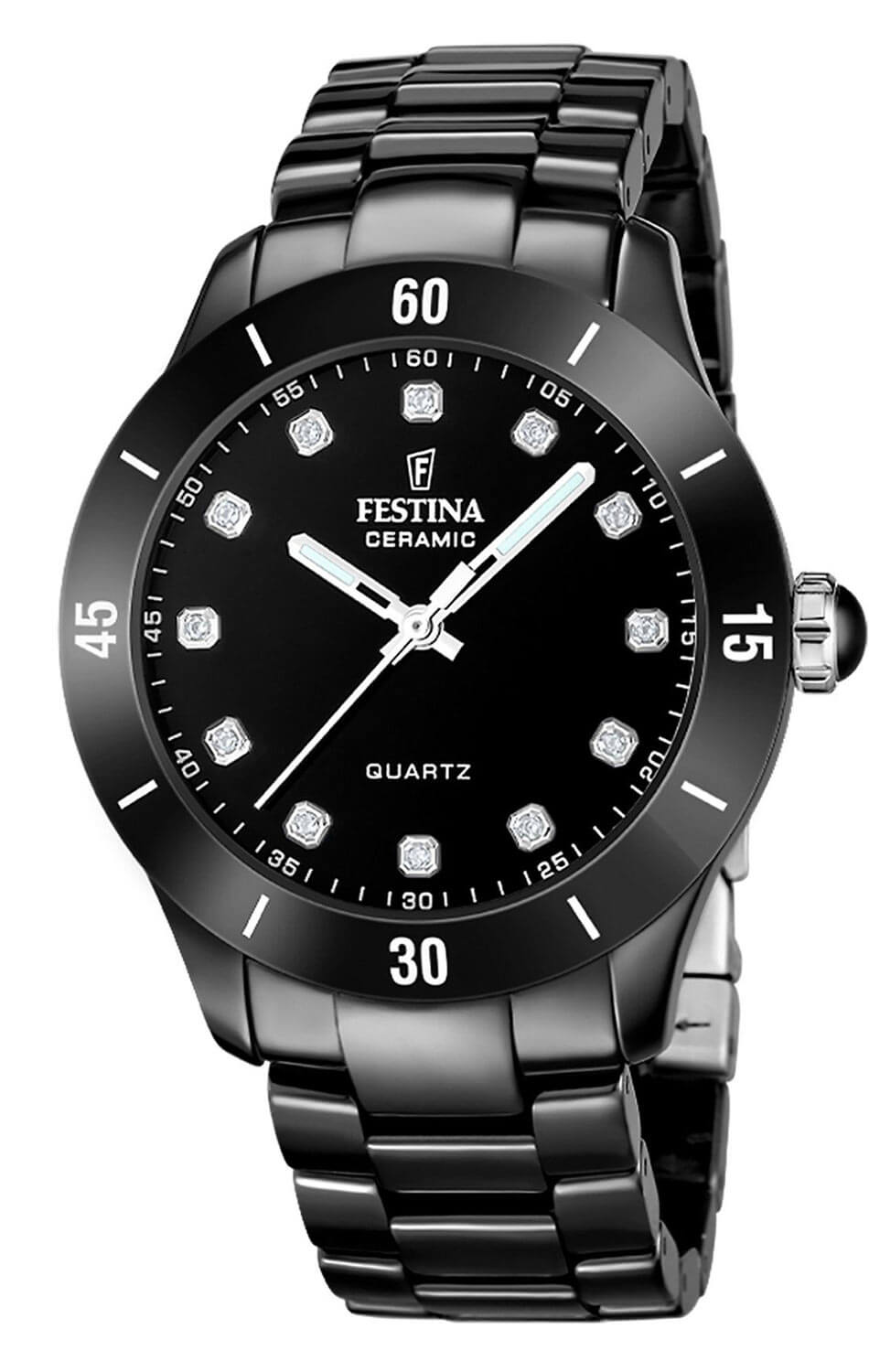 Na černém ciferníku je každá hodina ozdobena třpytivými krystaly, což ještě více podtrhuje eleganci tohoto modelu. Křemenný strojek zaručuje spolehlivou přesnost a keramická konstrukce, lehká a příjemná na dotek, zajistí pohodlí při nošení po mnoho let. Hodinky Festina na keramickém náramku jsou modelem, který díky své univerzální estetice najde uplatnění v různých situacích – od každodenních povinností až po slavnostní příležitosti.