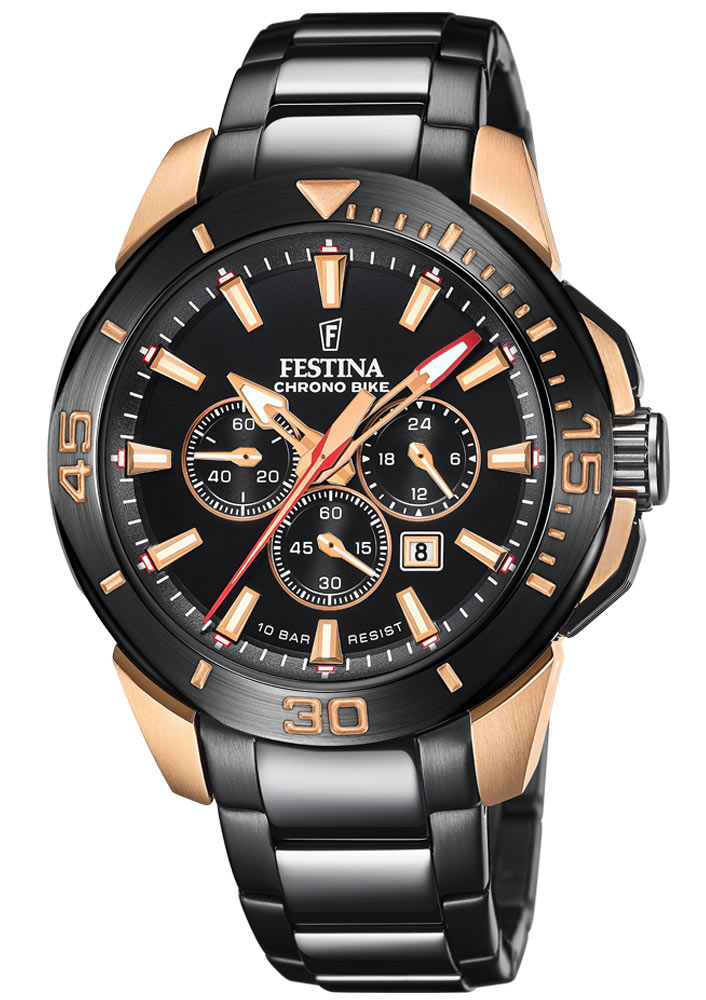 Speciální edice hodinek Festina Chrono Bike ke 120. výročí značky Festina. Tento model se prodává ve speciální krabici s přídavným gumovým páskem ve stylu camo a náMachineem na jeho výměnu. Festina F20645/1 má ocelové pouzdro o průměru 47 mm . Jeho horní část, prsten, je pokryta černým PVD povlakem a perfektně se hodí k černému náramku. Strany jsou PVD potažené růžovým zlatem a ladí s ručičkami a značkami na číselníku. Černý ciferník kryje minerální, tvrzené sklo. Velké čiré indexy a ručky obsahují luminiscenční látku, která ve tmě svítí. Jak se na sportovní hodinky sluší, používá Festina quartzový Machineek s funkcí data, chronografem a 24hodinovým zobrazením času. Náramek z nerezové oceli v kombinaci se sportovním pouzdrem s matným vzorem po stranách a leštěným uprostřed.