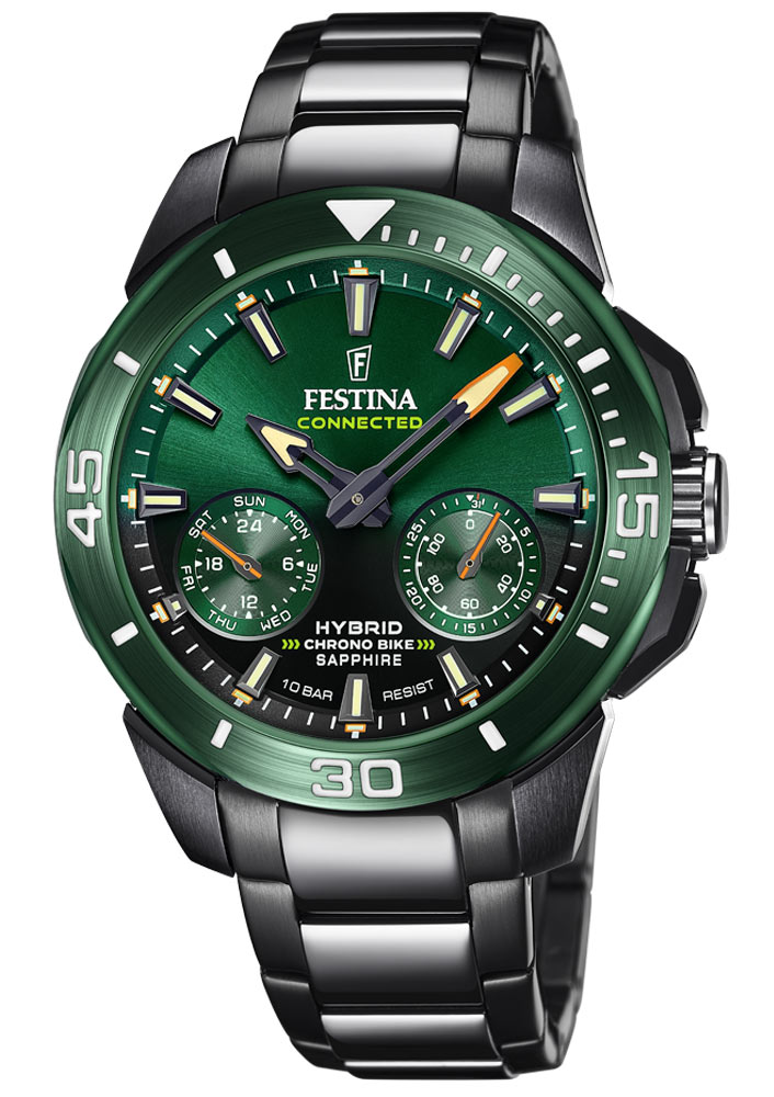 Model Festina F20646/1 si zachovává nadčasový design kola Chrono, věrně napodobuje pouzdro jeho slavné, působivé velikosti a také komplexně a okamžitě pociťovanou sportovní náladu. Propojené časovače splňují uživatele sadou inteligentních funkcí. Majitel může pocítit úlevu od neustálého spoléhání se na svůj telefon a vstoupit do dalšího segmentu, který mu technologie otevírá – hybridní chytré hodinky Festina. Zároveň, což je v současném shonu každodenních záležitostí nesmírně cenné, model F20646/1 umožňuje personalizovat notifikace, které se k uživateli dostávají prostřednictvím vibrací, aby dostával poznatky pouze o těch, které považuje za důležité.