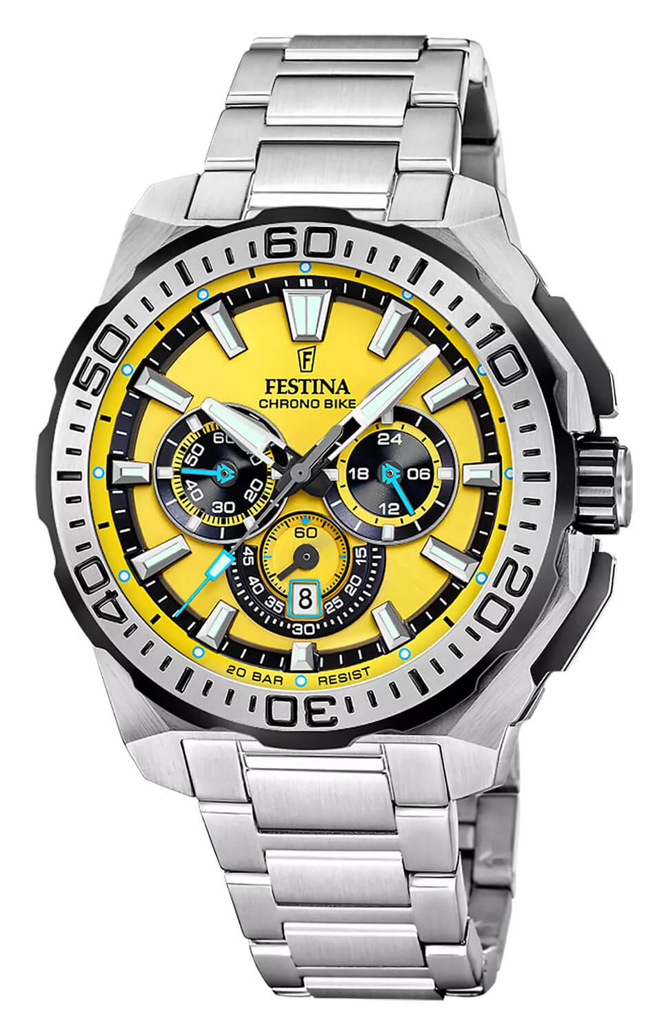 Výrazné stříbrné provedení s chladně žlutými detaily dodává modelu lehce futuristický, ale zároveň přehledný vzhled. Otočná luneta s přesnou stupnicí, kartáčované pouzdro o průměru 45.50 mm a ocelový náramek tvoří kompaktní a harmonický celek, jehož tvar následuje funkci. Díky vodotěsnosti do 200 metrů lze s hodinkami Festina i plavat. Na ciferníku se nacházejí subciferníky chronografu a datumové okénko na šesté hodině – vše je rozvrženo s důrazem na maximální čitelnost. Indexy a ručky s luminescenční vrstvou zajišťují viditelnost i po setmění. Jde o model promyšlený z hlediska ergonomie – pohodlně sedí na zápěstí, nepůsobí přehnaně, ale rozhodně zaujme.