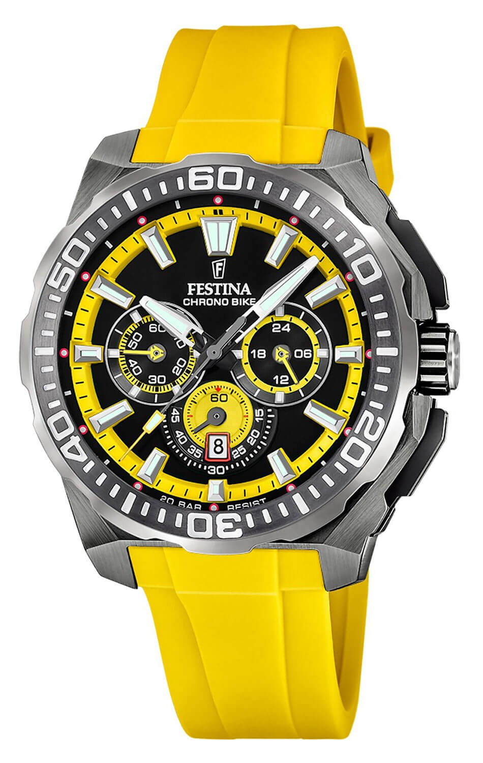 Výrazné stříbrné barevné provedení dodává modelu klasický vzhled. Otočná luneta s přesnou stupnicí, kartáčované pouzdro o průměru 45.50 mm a gumový řemínek tvoří kompaktní, soudržný celek, jehož forma následuje funkci. S hodinkami Festina lze plavat díky vodotěsnosti do 200 metrů. Na černém ciferníku se nacházejí subciferníky chronografu a datumové okénko na šesté hodině, rozvržené s důrazem na maximální čitelnost. Indexy a ručky s luminiscenční vrstvou zajišťují viditelnost i po setmění. Jde o design promyšlený z hlediska ergonomie – hodinky dobře sedí na zápěstí, nedominuje, ale rozhodně zaujmou.