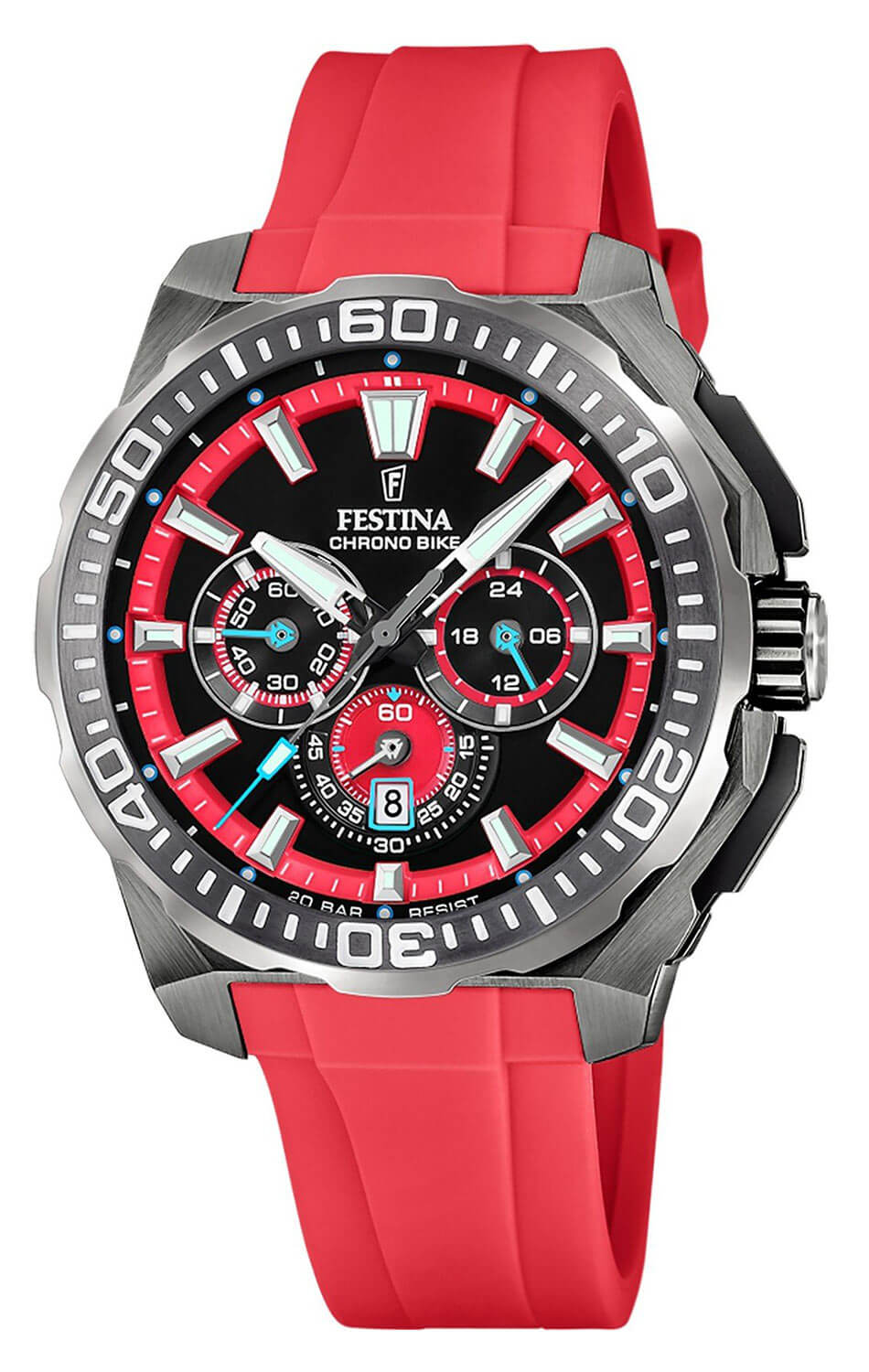 Výrazné stříbrné barevné provedení dodává modelu klasický vzhled. Otočná luneta s přesnou stupnicí, kartáčované pouzdro o průměru 45.50 mm a gumový řemínek tvoří kompaktní, soudržný celek, jehož forma následuje funkci. S hodinkami Festina lze plavat díky vodotěsnosti do 200 metrů. Na černém ciferníku se nacházejí subciferníky chronografu a datumové okénko na šesté hodině, rozvržené s důrazem na maximální čitelnost. Indexy a ručky s luminiscenční vrstvou zajišťují viditelnost i po setmění. Jde o design promyšlený z hlediska ergonomie – hodinky dobře sedí na zápěstí, nedominuje, ale rozhodně zaujmou.