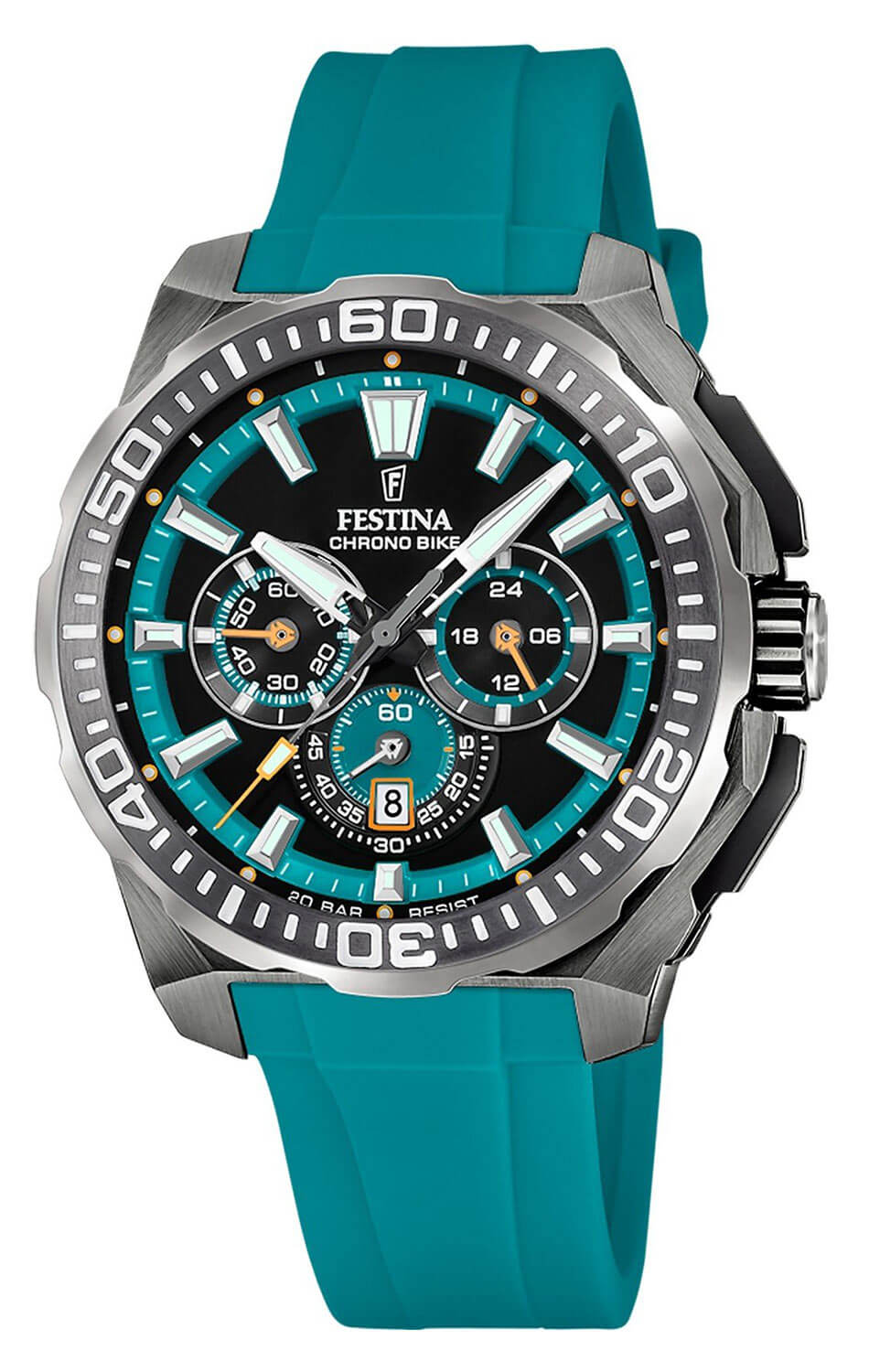 Výrazné stříbrné barevné provedení dodává modelu klasický vzhled. Otočná luneta s přesnou stupnicí, kartáčované pouzdro o průměru 45.50 mm a gumový řemínek tvoří kompaktní, soudržný celek, jehož forma následuje funkci. S hodinkami Festina lze plavat díky vodotěsnosti do 200 metrů. Na černém ciferníku se nacházejí subciferníky chronografu a datumové okénko na šesté hodině, rozvržené s důrazem na maximální čitelnost. Indexy a ručky s luminiscenční vrstvou zajišťují viditelnost i po setmění. Jde o design promyšlený z hlediska ergonomie – hodinky dobře sedí na zápěstí, nedominuje, ale rozhodně zaujmou.