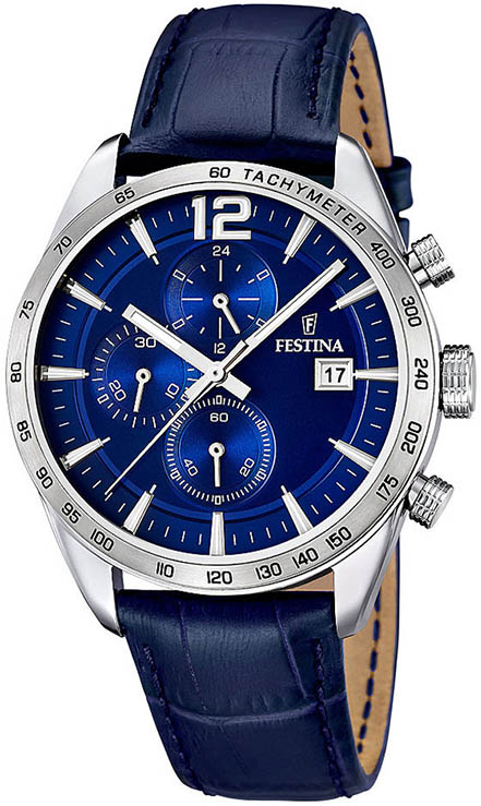 Elegantní pánské hodinky Festina s chronografem, stopkami měřícími vteřiny, minuty a 24 hodin. Elegantní odstín námořnické modři na ciferníku a koženém řemínku se skvěle hodí k obleku i každodennímu oblečení.