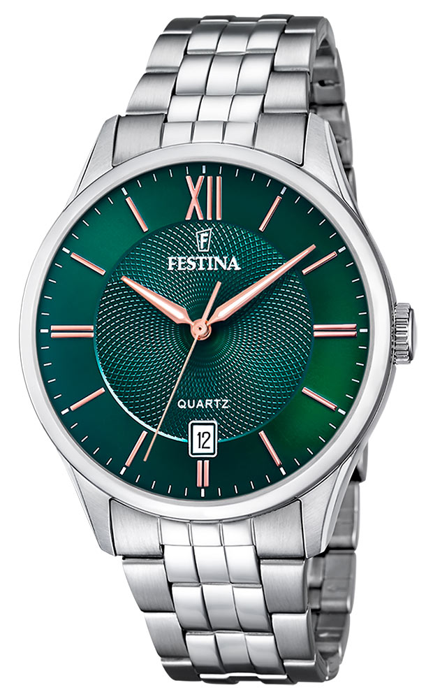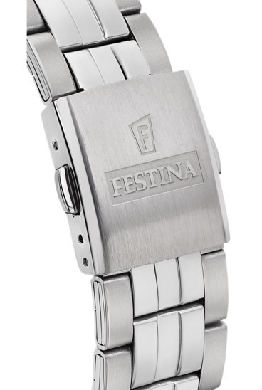 Vizuálně se model Festina Classic Bracelet vyznačuje především: propracovaným ciferníkem, tlumenými barvami, ocelovým náramkem s několika typy článků a quartzovým Machineem se 3 indikacemi.