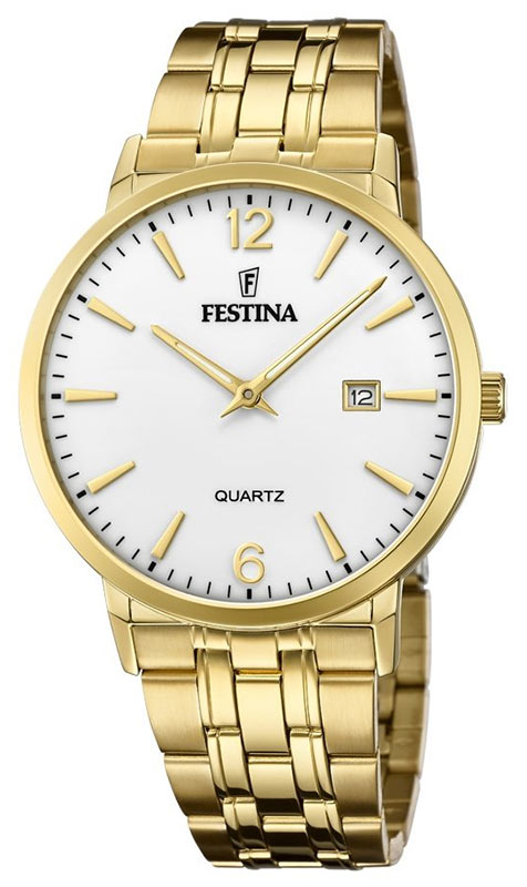 Hodinky Festina Classic F20513/2 jsou celé vyrobeny z PVD nerezové oceli zlaté barvy, jejíž vlastnosti uspokojivě a po léta chrání před korozí, poškrábáním nebo zašednutím. Bílý analogový ciferník s klasickou hodinovou stupnicí a datumovkou je chráněn uspokojivě odolným minerálním sklíčkem. O přesný pohyb je zodpovědný bateriový Machineek Quartz.