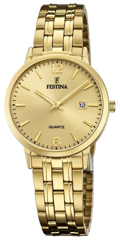 Hodinky Festina Classic F20514/3 jsou celé vyrobeny z PVD nerezové oceli zlaté barvy, jejíž vlastnosti uspokojivě a po léta chrání před korozí, poškrábáním nebo zašednutím. Sluncem broušený zlatý analogový ciferník s klasickou hodinovou stupnicí a datumovkou je chráněn uspokojivě odolným minerálním sklem. O přesný pohyb je zodpovědný bateriový Machineek Quartz.
